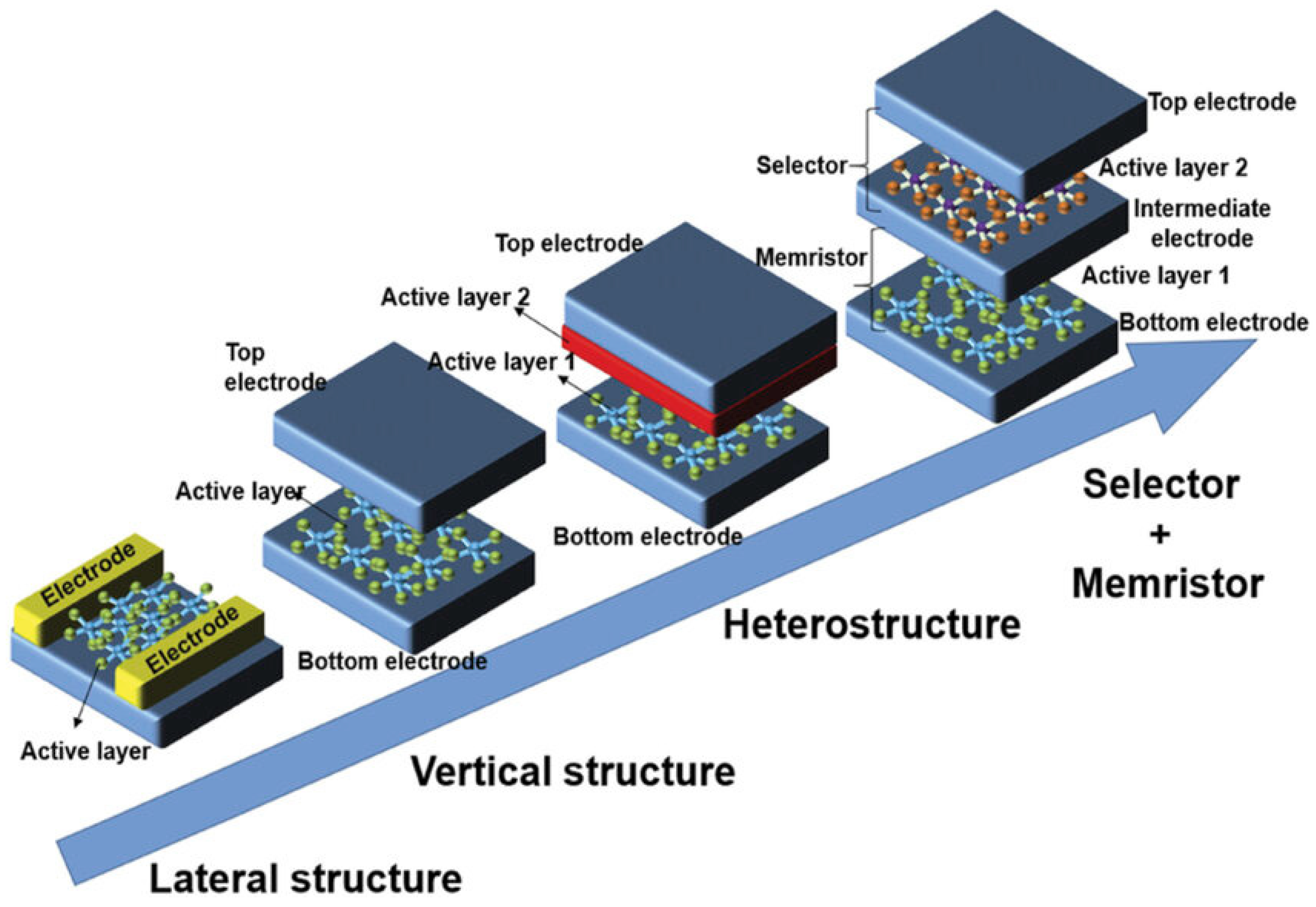 Figure 19. Schematic illustration of various memristor device architectures, progressing from lateral to vertical structures, heterostructures, and integrated selector–memristor configurations. Each design consists of electrodes and one or more active layers, enabling diverse switching behaviors and improved device performance. This figure is adapted from ref. [93] (reproduced under terms of the CC-BY license).