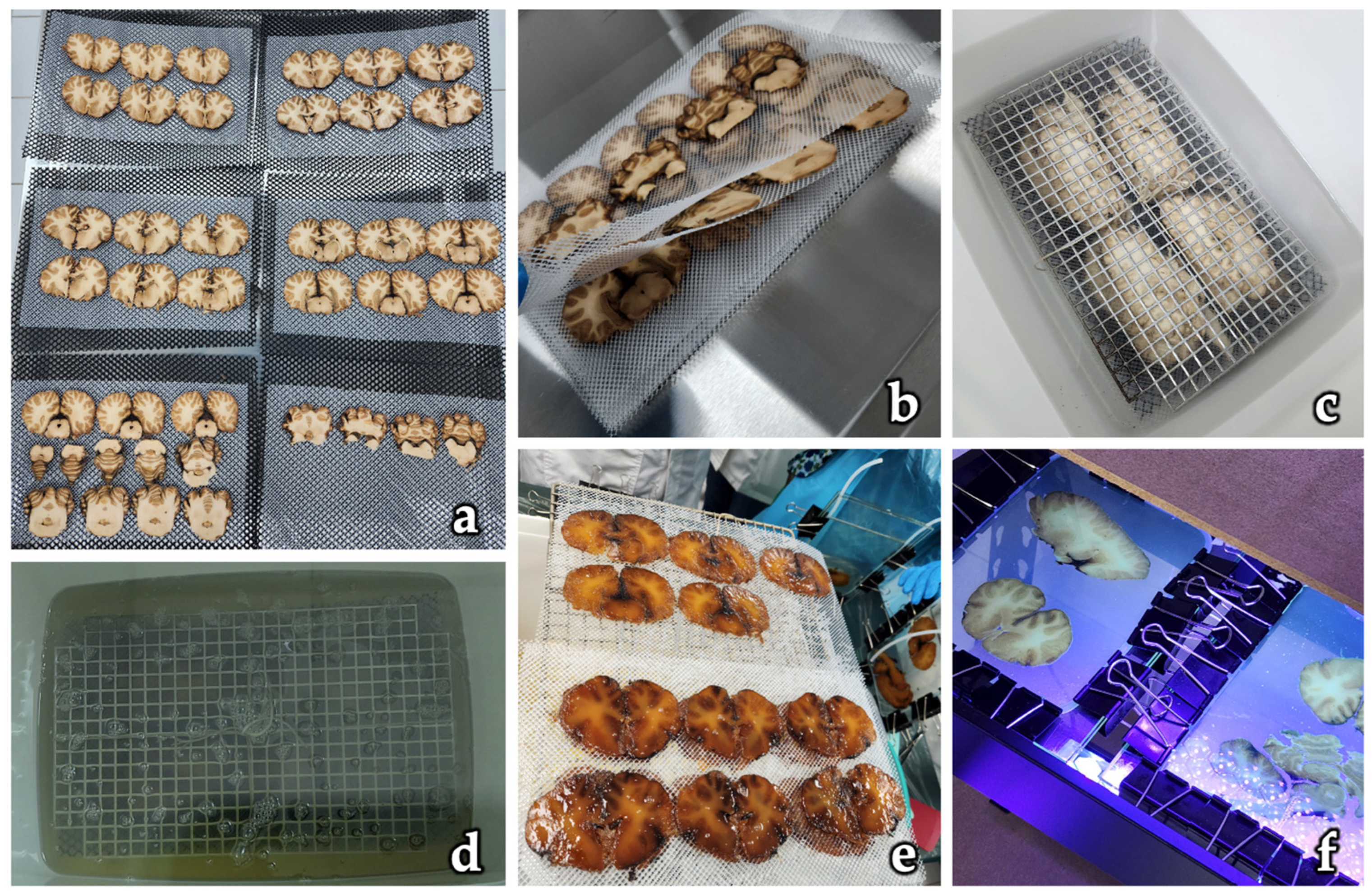 - Barnett, R.J. Plastination of Coronal and Horizontal Brain Slices Using the P40 Technique. J. Int. Soc. Plast. 1997, 12, 33–36. [Google Scholar] [CrossRef]