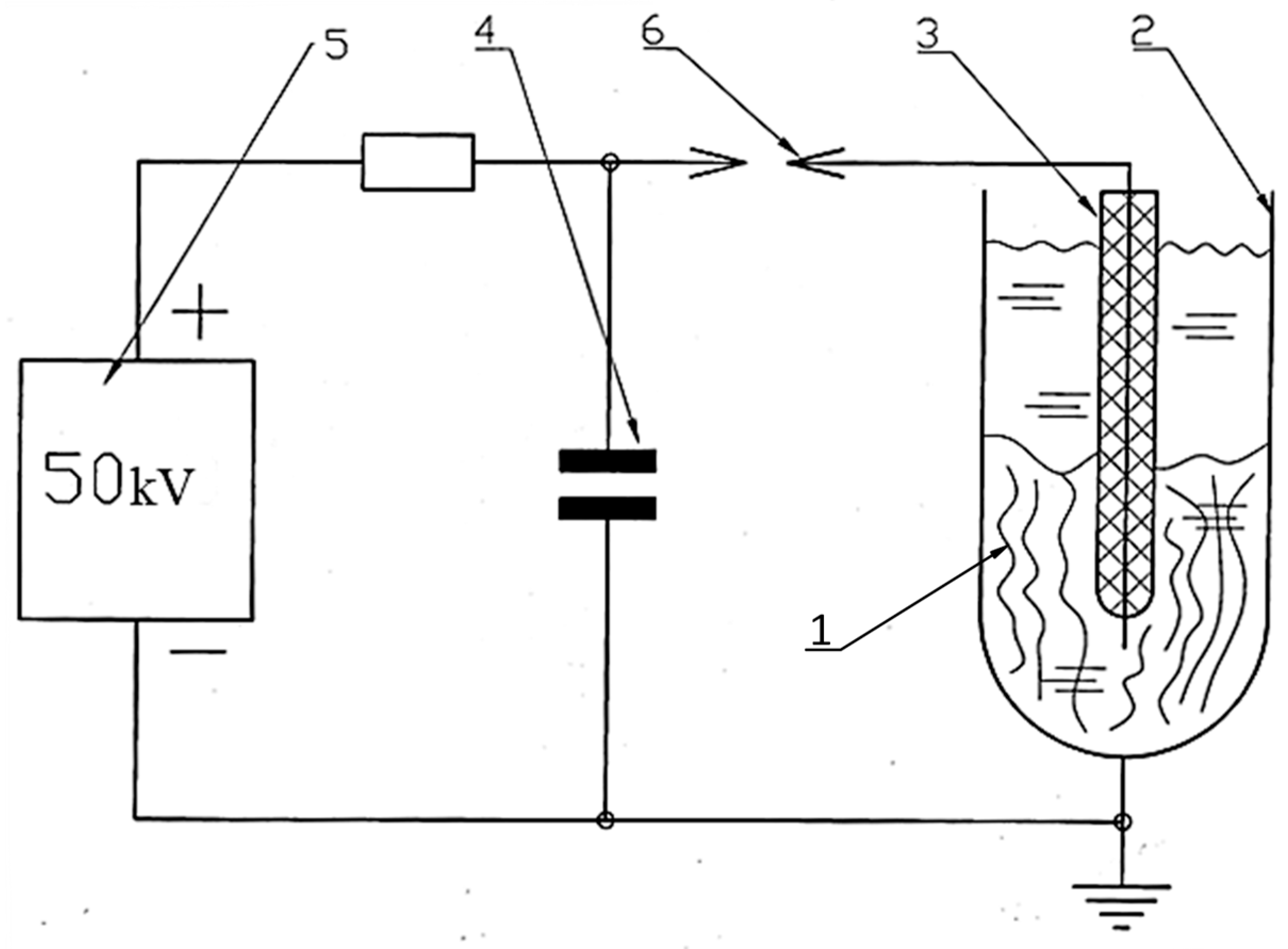 2 and subjected to a shock wave and cavitation generated by a powerful electric discharge between electrode