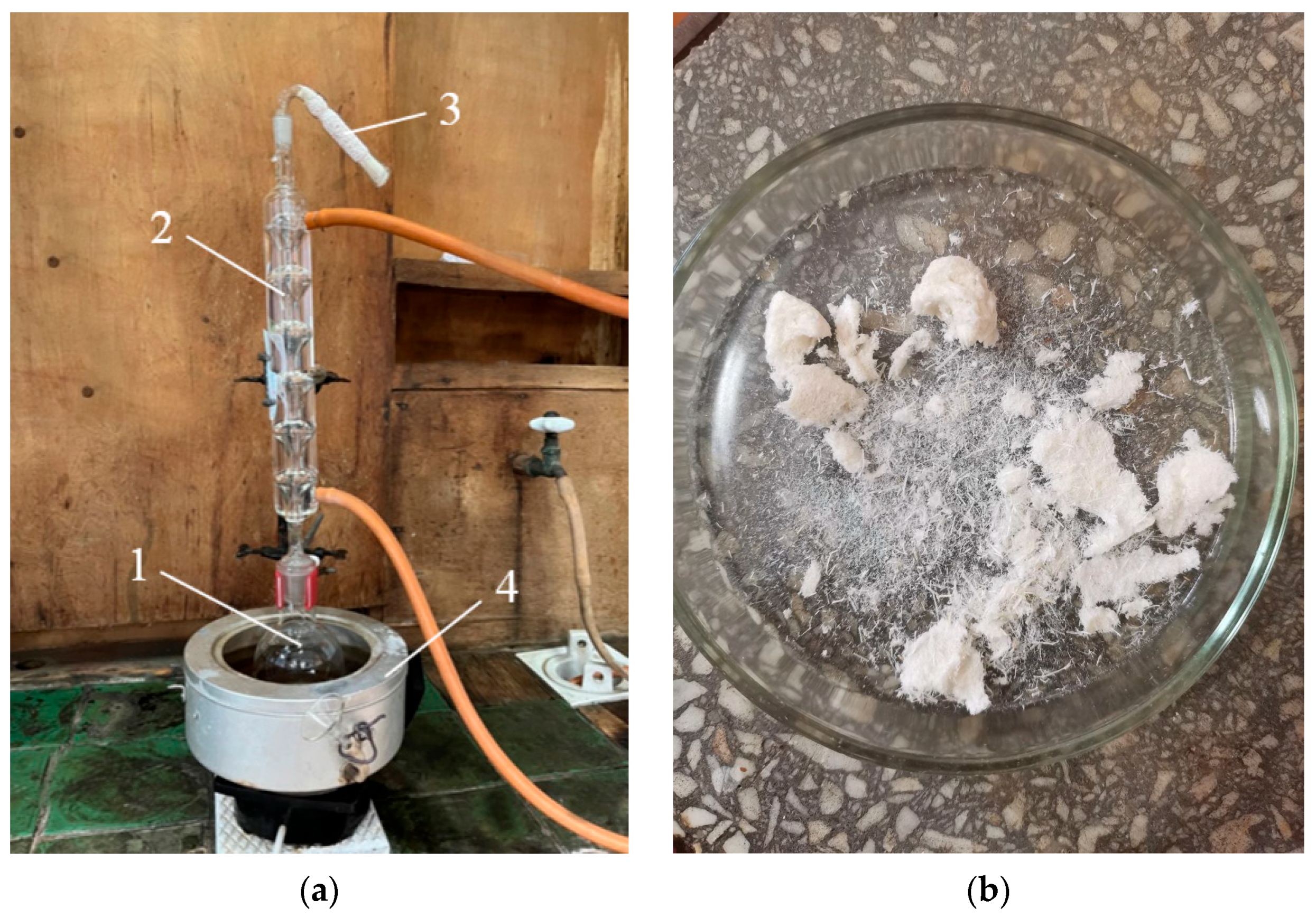 27]. A sample was sequentially treated with a mixture of concentrated nitric acid and ethanol. Ethanol inhibits the degradation of cellulose by the acid, while hemicelluloses are predominantly hydrolyzed. Lignin undergoes nitration and partial oxidation, dissolving in the solution. After four treatment cycles, the cellulose became discolored, acquiring a pure white color (
