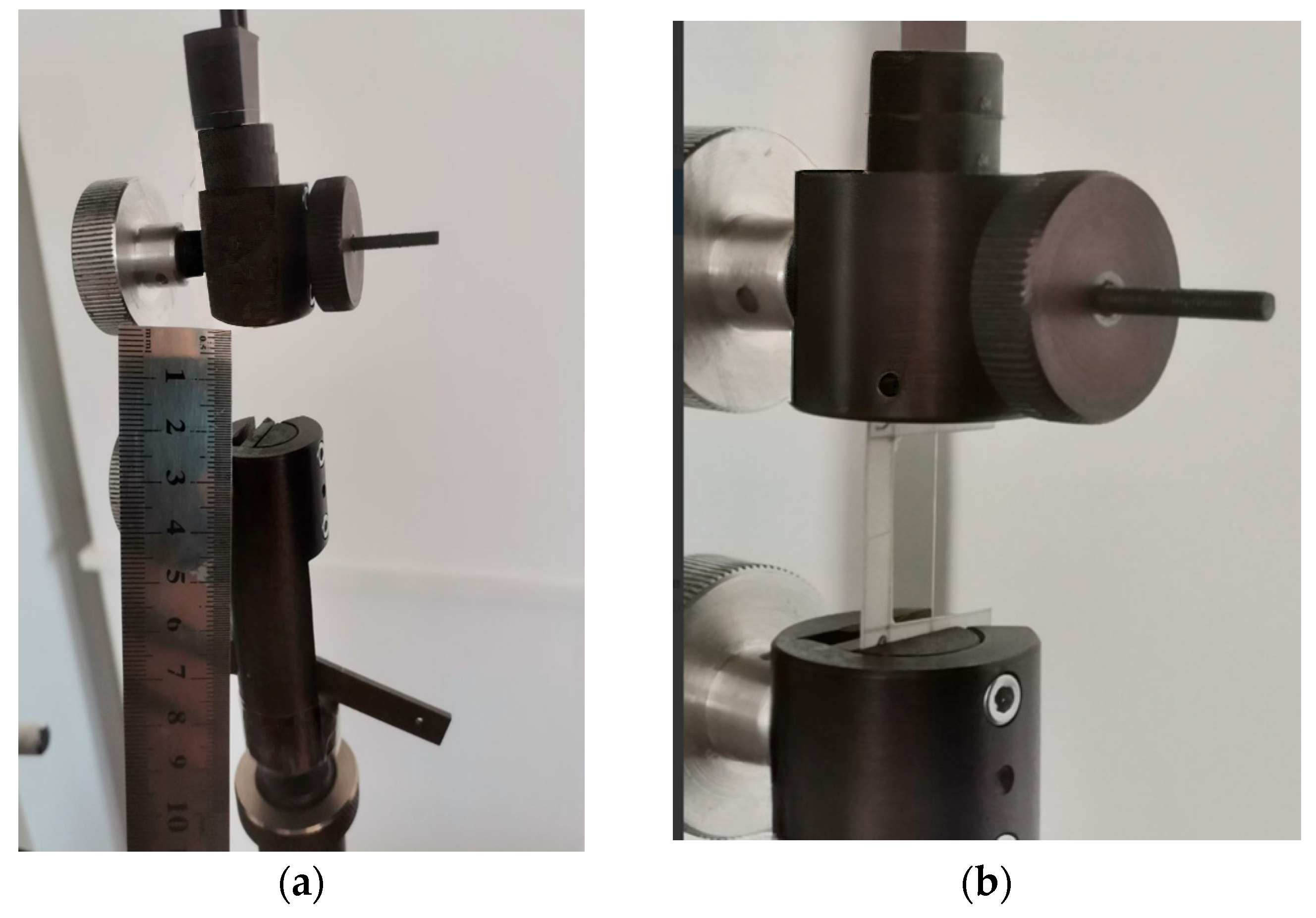Figure 9). The calculations used the initial cross-sectional area and initial length of the sample. Test conditions were as follows: tensile speed of 0.1 mm/min, preload of 1 N, and preload application speed of 20 mm/min.