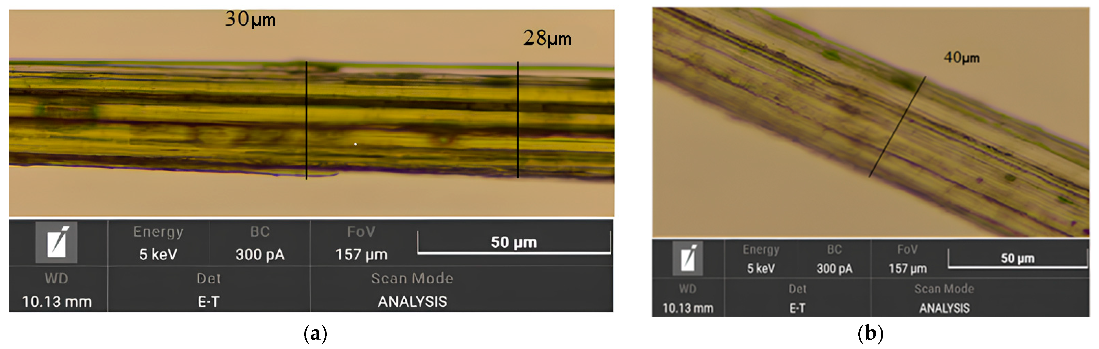 34]. Fiber diameter is critical for strength and elastic modulus, so it was measured with a thickness gauge and microscopy. As a result, the following points were established: