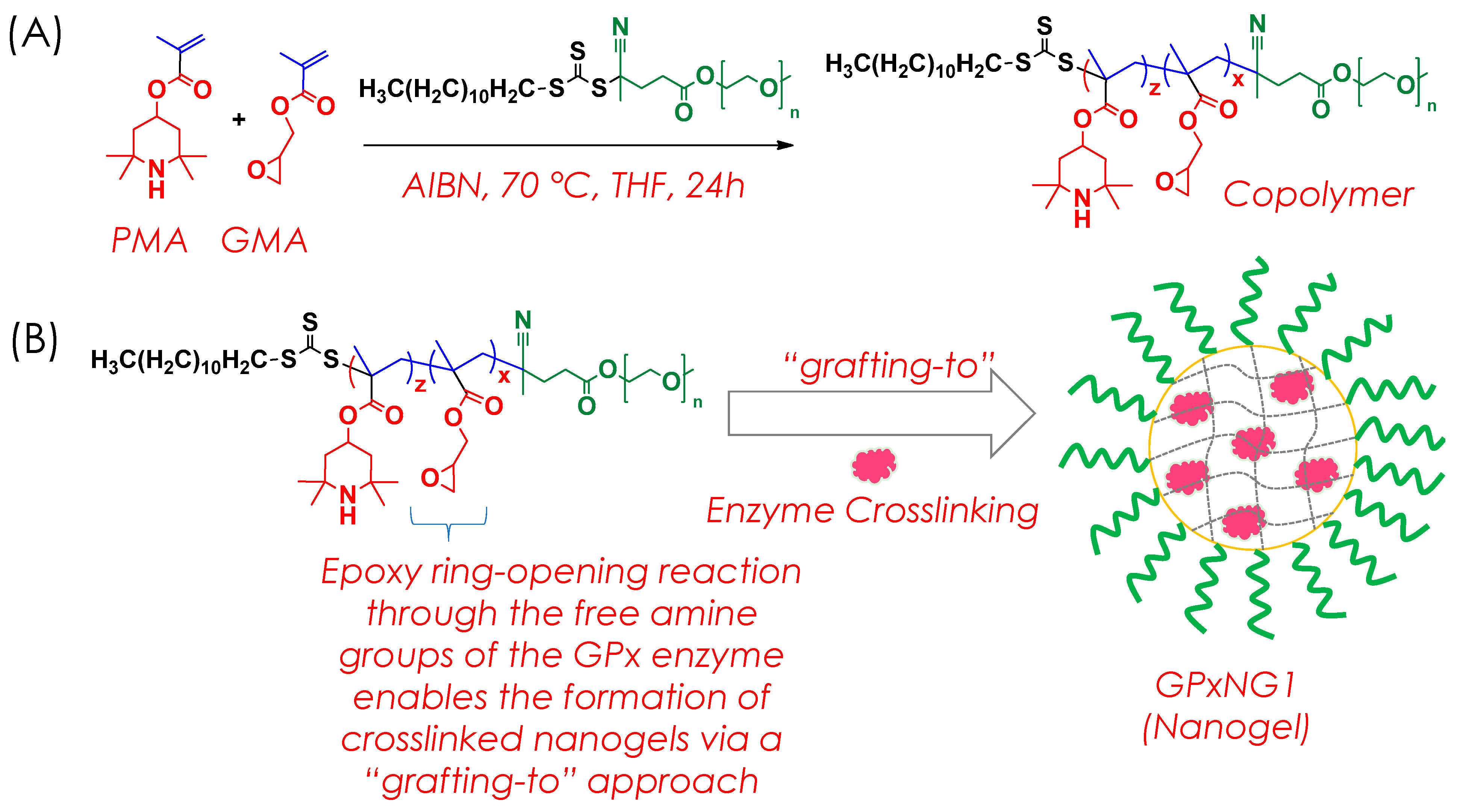 The grafting-to polymerization approach offers a promising strategy to immobilize GPx enzyme within nanogels while retaining its catalytic activity. In this work, we employed an epoxy–amine coupling mechanism to covalently link GPx enzyme onto a reactive amphiphilic copolymer synthesized via controlled RAFT polymerization of methacrylated 2,2,6,6-tetramethyl-4-piperidyl (PMA) and glycidyl methacrylate (GMA) using PEG macro-CTA. The epoxy groups of the polymer readily react with the free amine residues of GPx, forming stable, covalently crosslinked PEGylated nanogels under mild aqueous conditions. This strategy enables precise control over molecular architecture and enzyme loading while avoiding harsh solvents or initiators that could denature the enzyme [