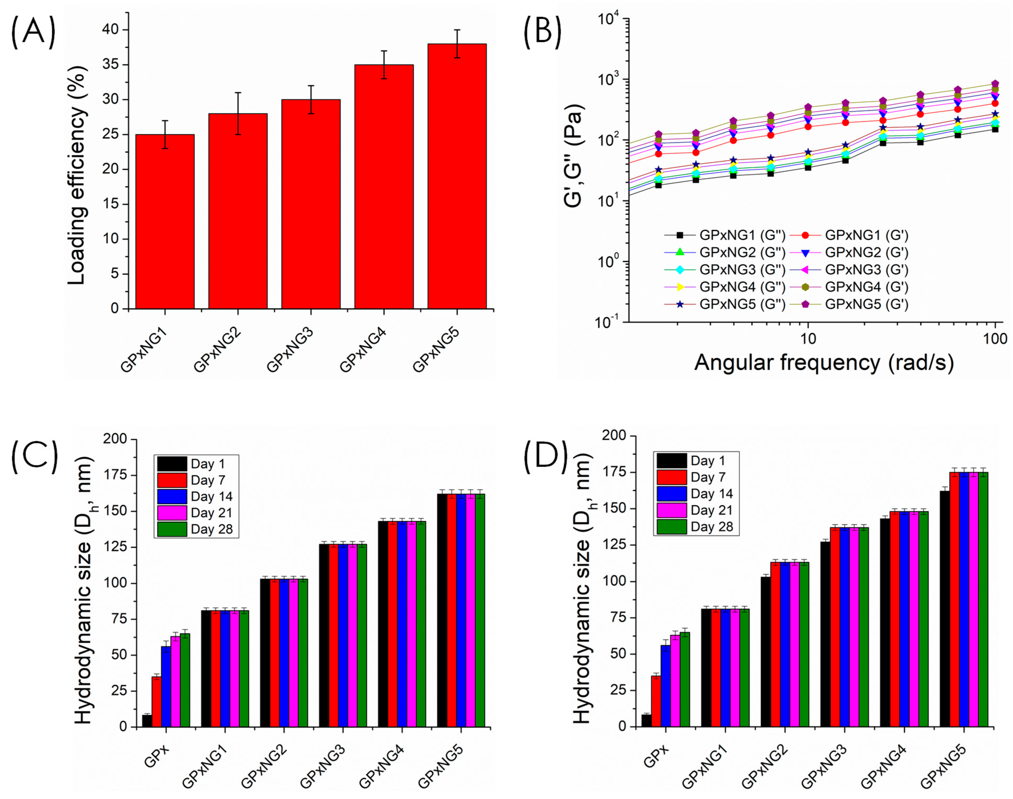 Figure 5A. The loading efficiency increased from GPxNG1 to GPxNG5 because higher enzyme concentrations provided more accessible amine groups for epoxy–amine coupling, resulting in more efficient crosslinking and greater incorporation of GPx into the nanogel network. Rheological analysis demonstrated that all GPxNGs exhibited storage modulus (G′) values higher than loss modulus (G″), indicative of their viscoelastic and gel-like nature (