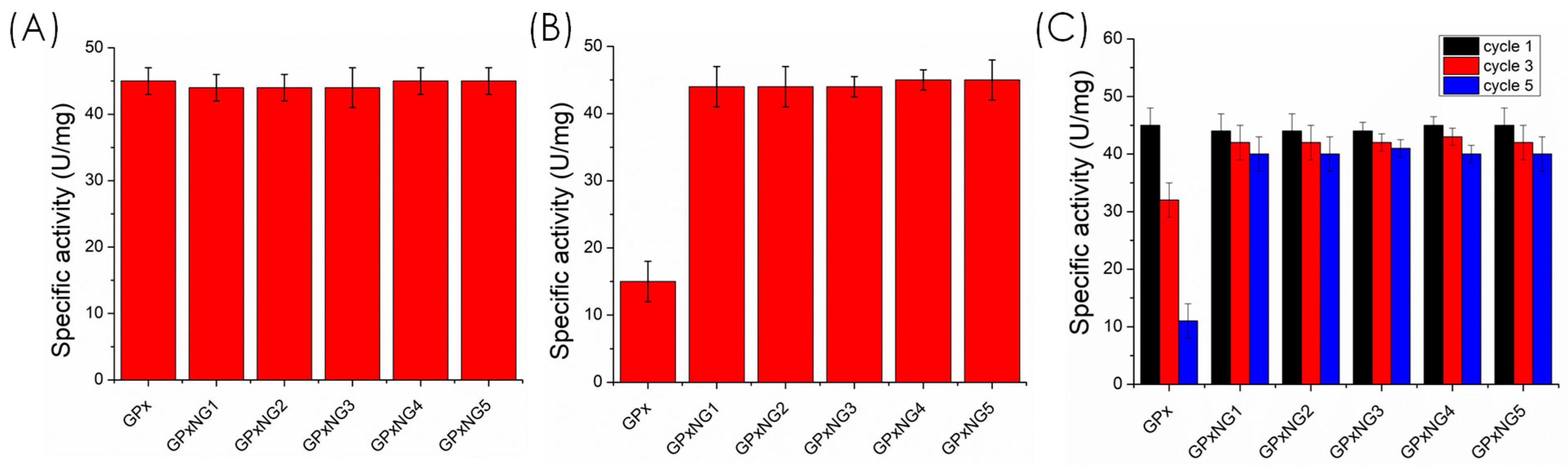 Figure 9). This protective effect arises from the confinement of the GPx enzyme within the flexible polymeric network, which minimizes structural unfolding and aggregation. Moreover, GPxNGs maintained catalytic efficiency after repeated use, confirming their reusability [