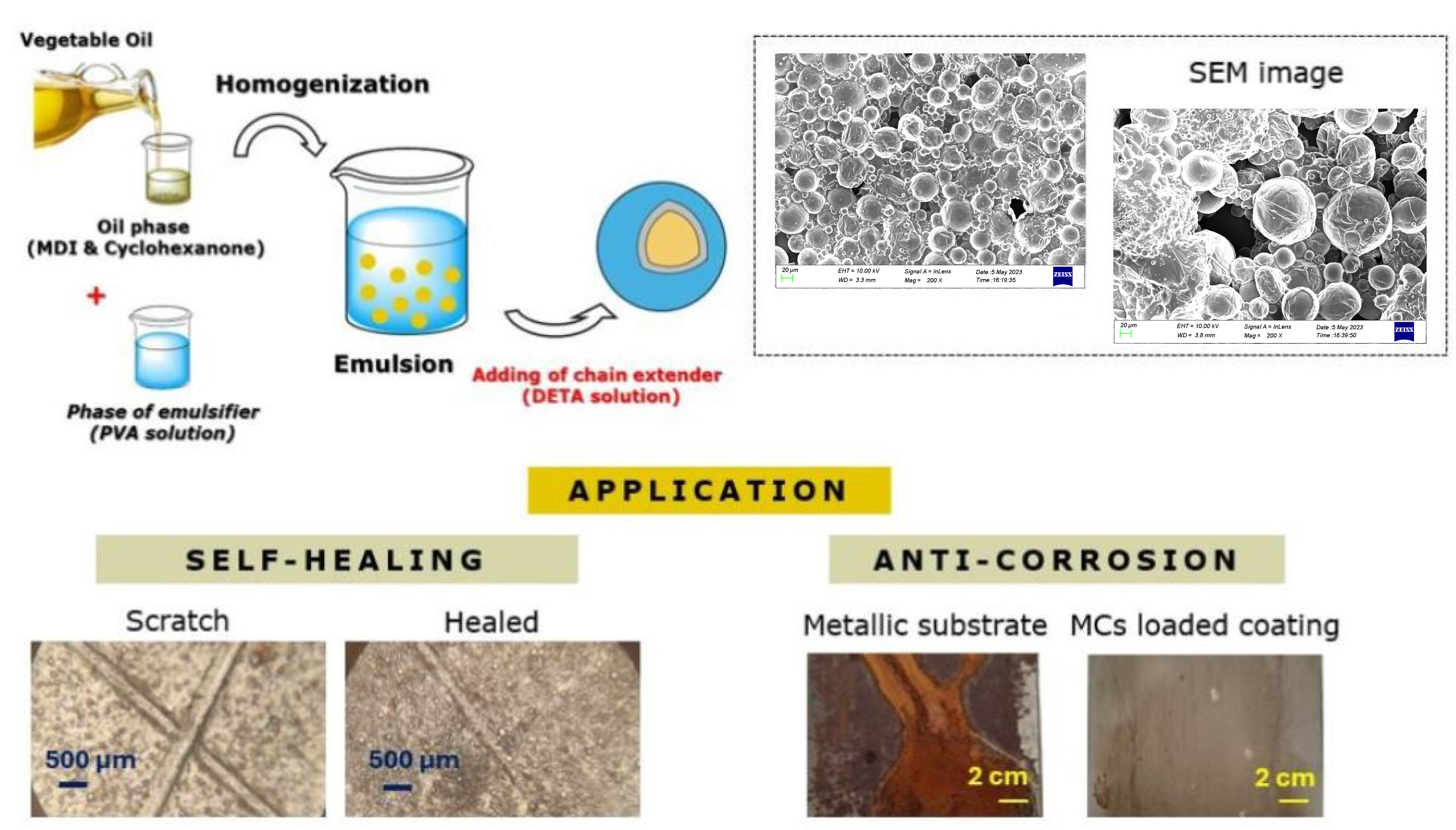 Avdeliodi E, Derizioti S, Papadopoulou I, Arvaniti A, Krassa K, Kalogianni EP, Kallitsis JK, Bokias G. Vegetable-Oil-Loaded Microcapsules for Self-Healing Polyurethane Coatings. Polymers. 2025; 17(23):3184. https://doi.org/10.3390/polym17233184