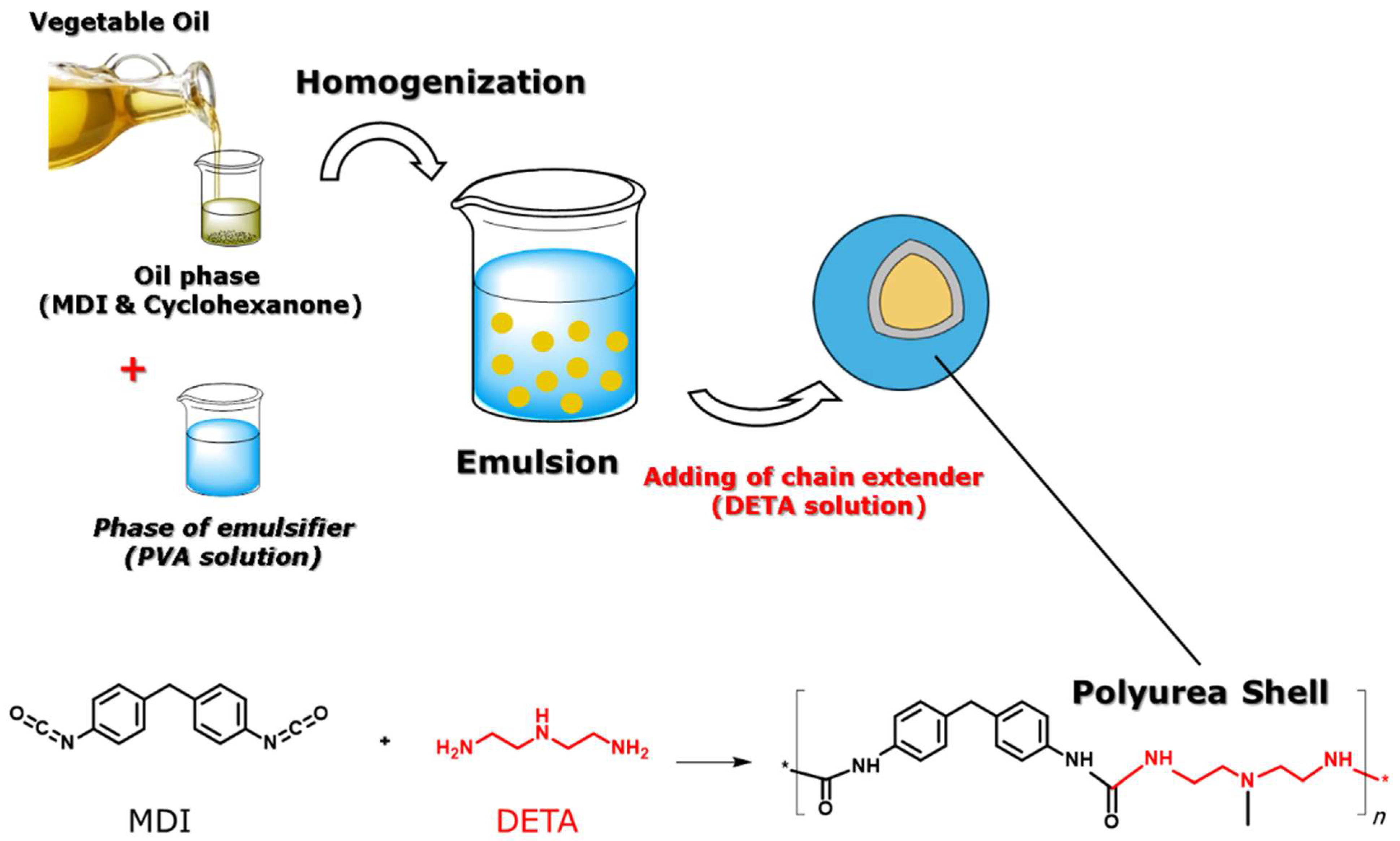 - Avdeliodi, E.; Tsioli, A.; Bokias, G.; Kallitsis, J.K. Controlling the Synthesis of Polyurea Microcapsules and the Encapsulation of Active Diisocyanate Compounds. Polymers 2024, 16, 270. [Google Scholar] [CrossRef]