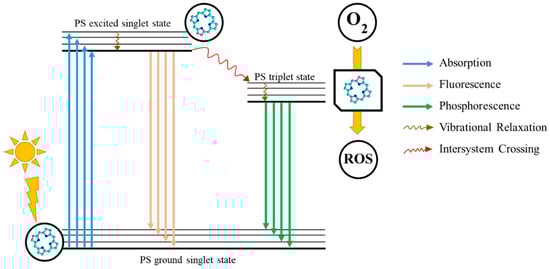 Photosensitizers (PSs) constitute a vital class of therapeutic agents used in combination with nanocarriers to tackle both severe and benign medical issues. They are highly important for photodynamic therapy (PDT), which is a minimally invasive anticancer or antimicrobial treatment that involves a PS, visible light, and molecular oxygen to generate reactive oxygen species (ROS), which are capable of selectively destroying cancer cells or pathogens (Figure 1) []. Upon light activation, PS undergoes transitions to an excited state initiating photochemical reactions, which then lead to cytotoxic ROS, particularly singlet oxygen as the most active agent []. PDT demonstrates highly localised action, resulting in minimal damage to surrounding healthy tissues—a significant improvement over systemic chemotherapies [,]. However, PDT efficacy is restricted by its limited tissue light penetration (typically <1.5 cm) and the pharmacokinetics of PS []. Due to its precision and tissue-sparing properties, modern applications of PDT include the treatment of various cancers, such as those of the skin, bladder, oesophagus, lung, and pancreas [,].