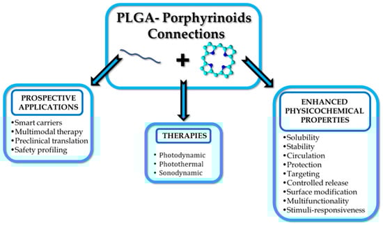 In this review, we present the specific aspects of the last 20 years of research on PLGA-based nanoparticles encapsulating selected porphyrinoid-type photosensitizers from porphyrin and chlorin subclasses, such as protoporphyrin IX, tetrahydroxyphenylporphyrin, chlorin e6, and tetracarboxyphenylporphyrin. We intentionally excluded phthalocyanines (Pcs) as photosensitizers from this review due to an already sufficient amount of data regarding PLGA-porphyrin nanosystems. We do however acknowledge that Pcs encapsulated in biodegradable PLGA nanoparticles combine the strong near-IR absorption and high triplet-state yields of Pcs with the biocompatibility, colloidal stability and controlled-release behaviour of PLGA carriers, thus improving aqueous solubility, reducing Pc aggregation, and enhancing tumour accumulation and photodynamic efficacy in vitro and in vivo [,,]. However, to date, several reviews regarding phthalocyanines have already been published, which sufficiently highlight the advantage of PLGA-based carriers in overcoming the aforementioned limitations of Pcs as photosensitizers in PDT [,].