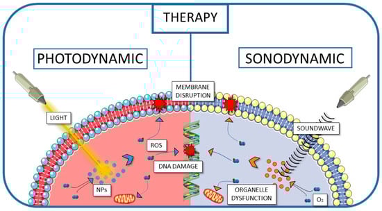 PPIX in connection with PLGA and various biopolymers has also been subjected to diverse activation mechanisms, aiming to overcome the limitations of conventional light-triggered PDT. PPIX has to be activated, and the transfer of the absorbed energy is possible not only by light but also by ultrasound. Therefore, the utilisation of PLGA-based nanoparticles containing PPIX has also been assessed in sonodynamic therapy (SDT). Sonodynamic therapy uses ultrasound to activate specialised sonosensitizers, which then generate ROS within targeted cancer tissues. The mechanical and cavitation effects of ultrasound enhance the activation of sensitisers and promote localised ROS production [,]. These reactive oxygen species can destroy cancer cells by oxidising lipids and damaging the membrane, as well as disrupting DNA and affecting the function of organelles [], similar to the ROS produced in the mechanism used in PDT (Figure 4).