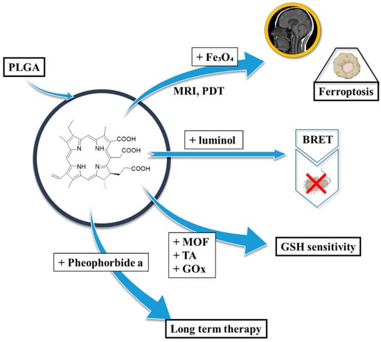 Chlorin e6 in polymeric nanoparticles—properties and applications; BRET—bioluminescence resonance energy transfer, GOx—glucose oxidase, GSH—glutathione, MOF—metal–organic framework, MRI—magnetic resonance imaging, PDT—photodynamic therapy, TA—tannic acid.
