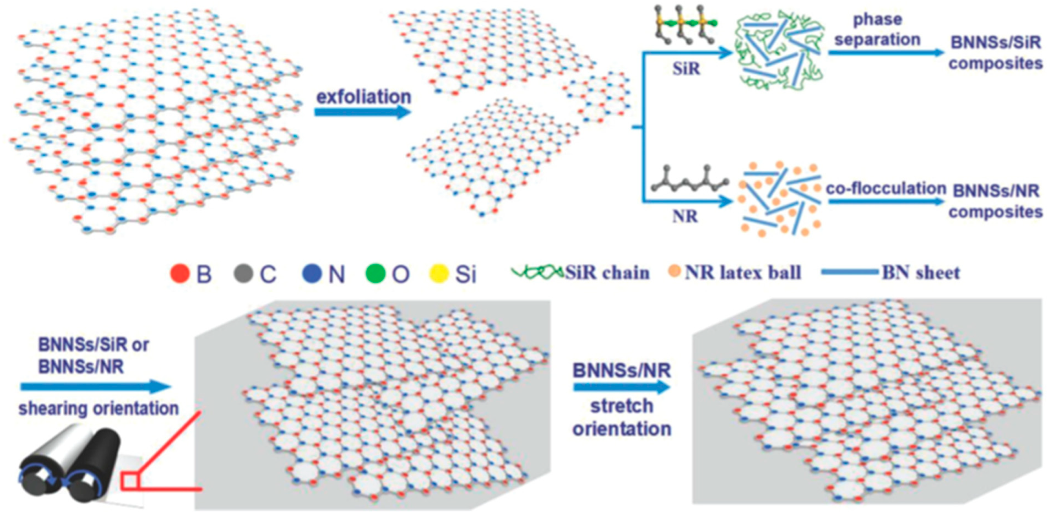 - Kuang, Z.; Chen, Y.; Lu, Y.; Liu, L.; Hu, S.; Wen, S.; Mao, Y.; Zhang, L. Fabrication of Highly Oriented Hexagonal Boron Nitride Nanosheet/Elastomer Nanocomposites with High Thermal Conductivity. Small 2015, 11, 1655–1659. [Google Scholar] [CrossRef]