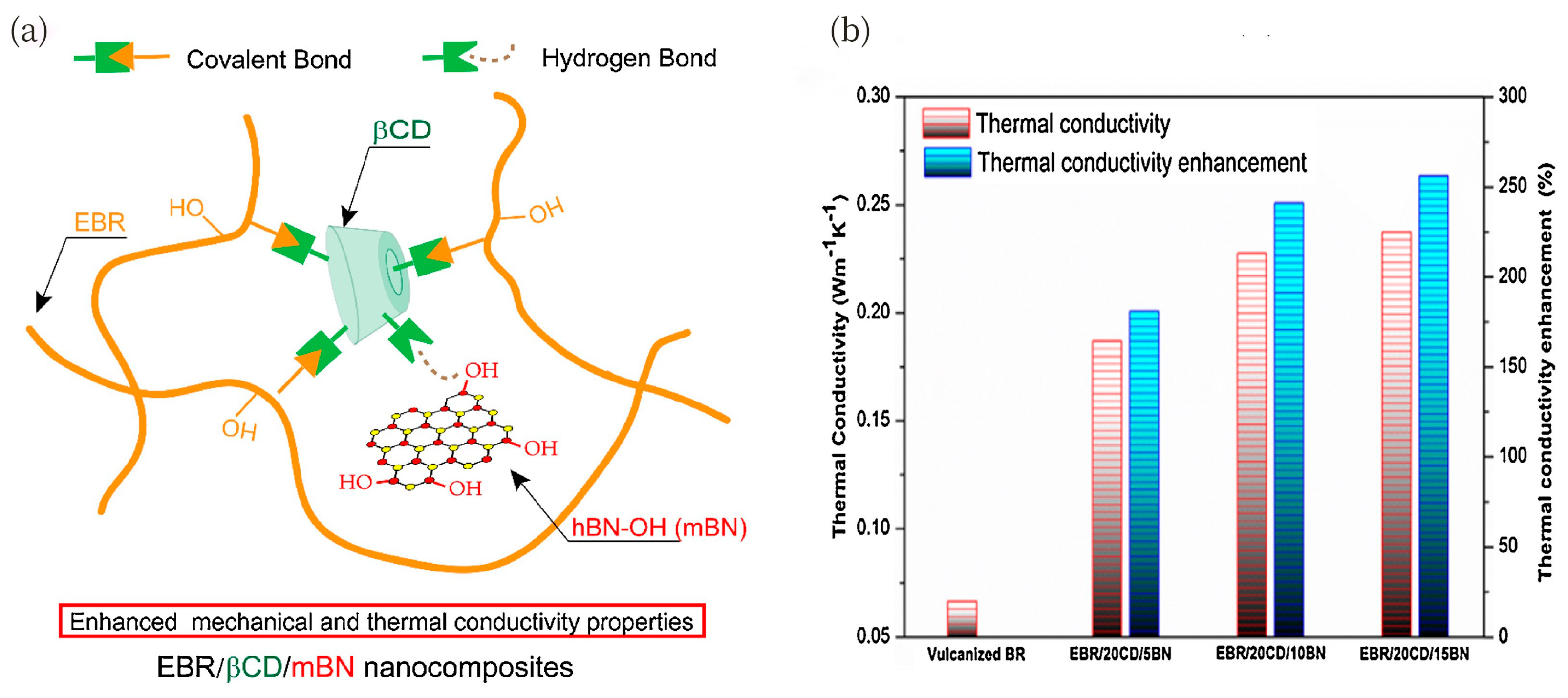 - Yang, Y.; Huang, L.; Dai, Q.; Cui, L.; Liu, S.; Qi, Y.; Dong, W.; He, J.; Bai, C. Fabrication of β-Cyclodextrin-Crosslinked Epoxy Polybutadiene/Hydroxylated Boron Nitride Nanocomposites with Improved Mechanical and Thermal-Conducting Properties. J. Mater. Res. Technol. 2019, 8, 5853–5861. [Google Scholar] [CrossRef]
