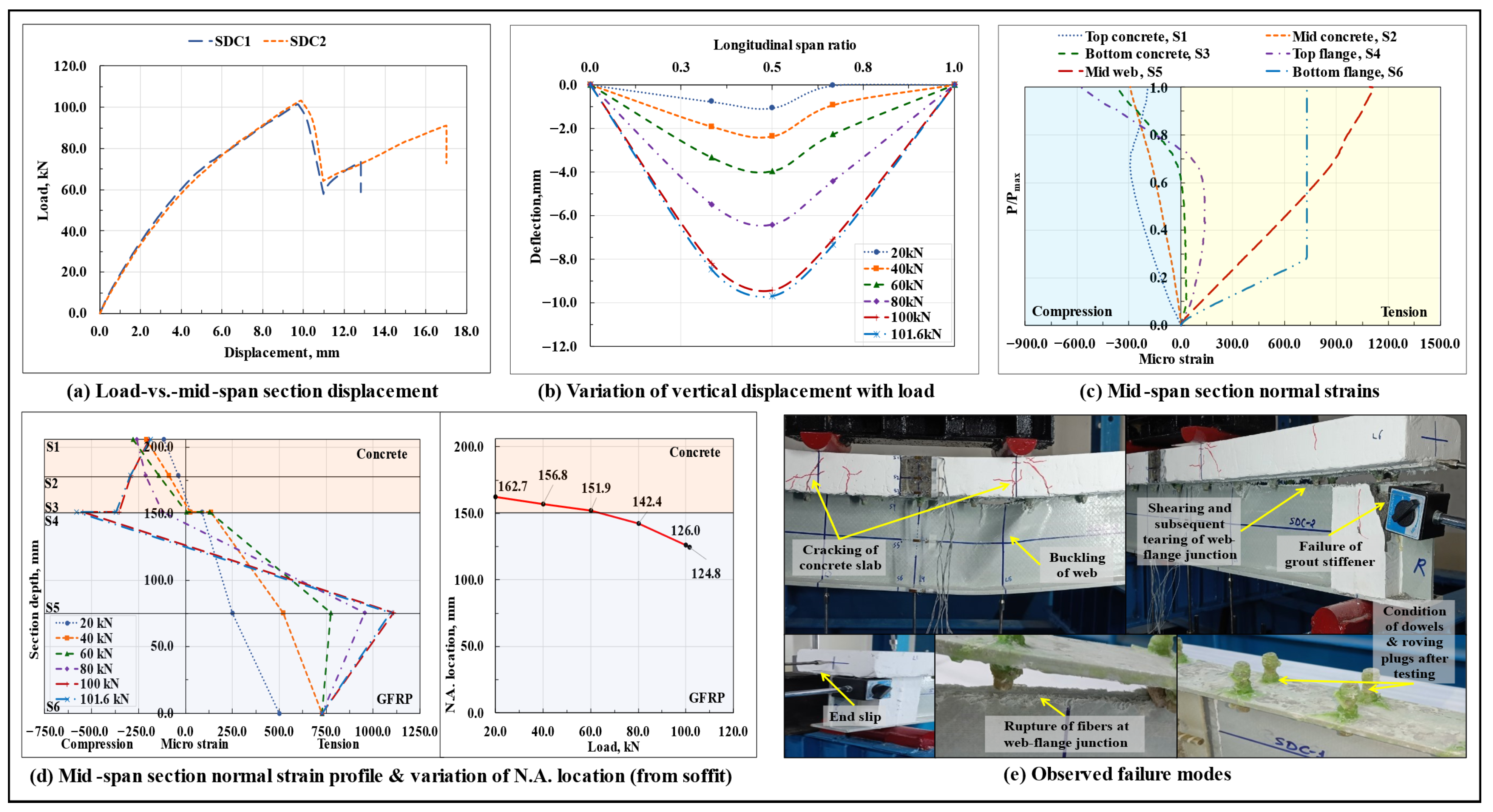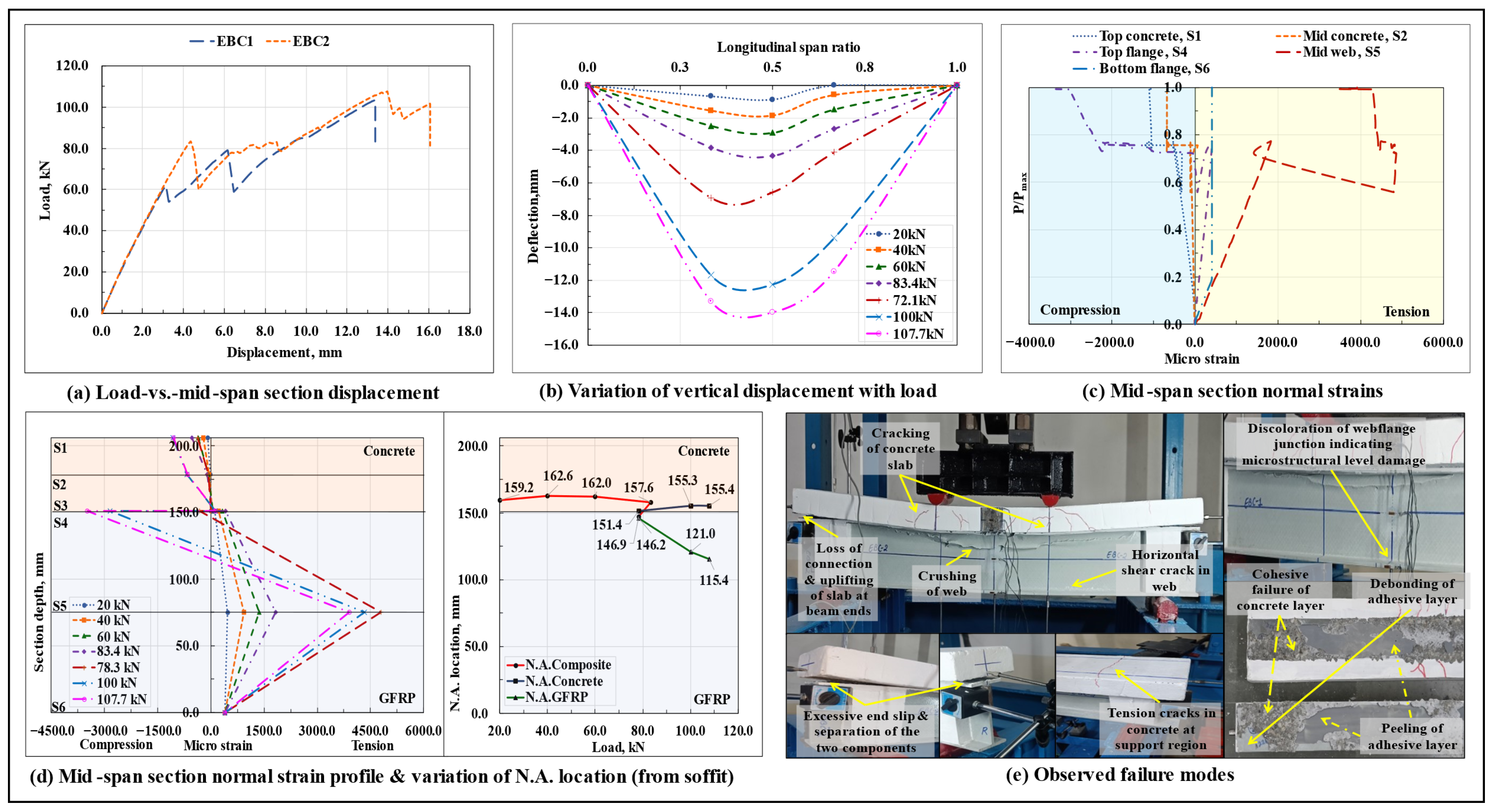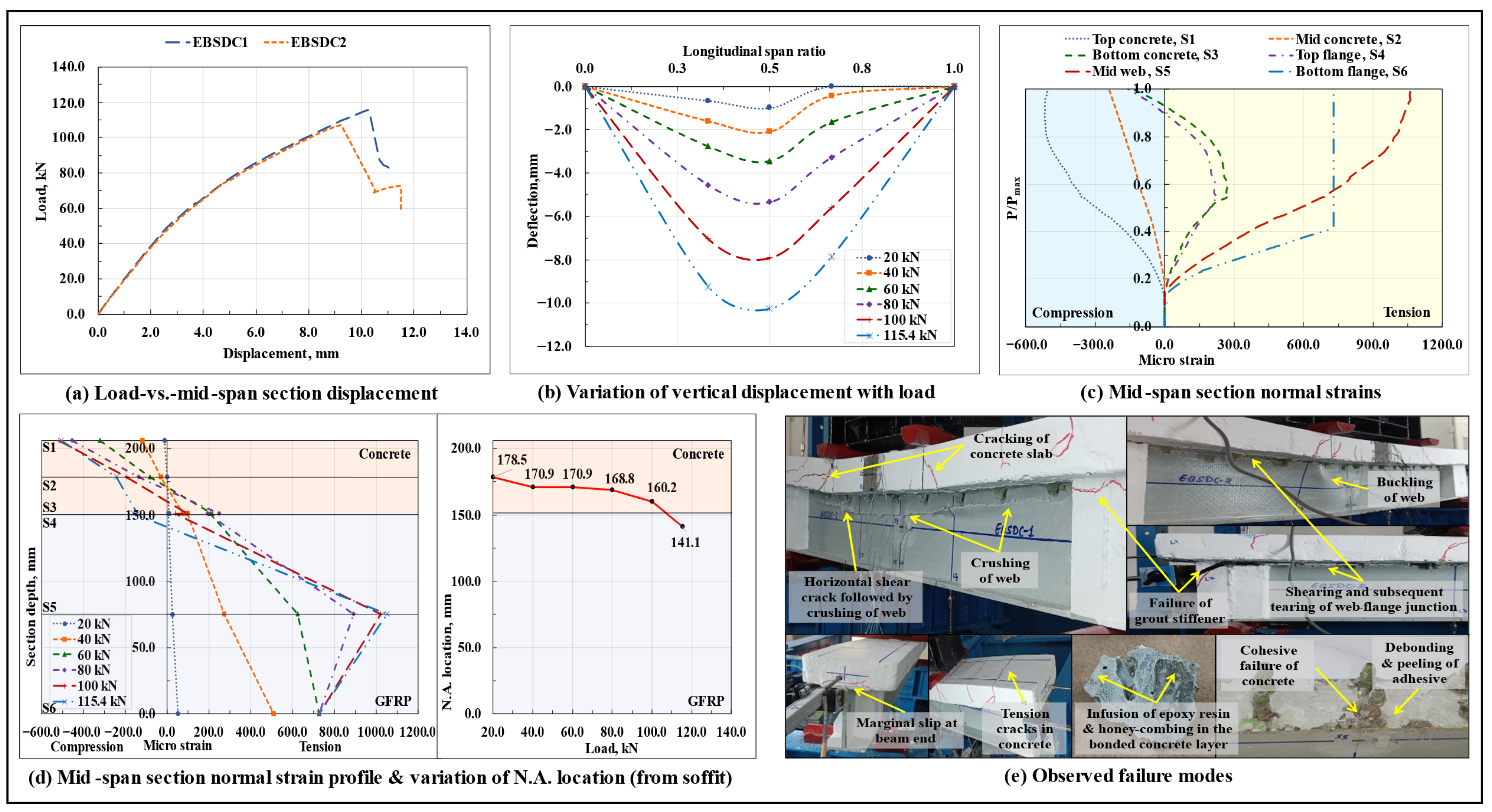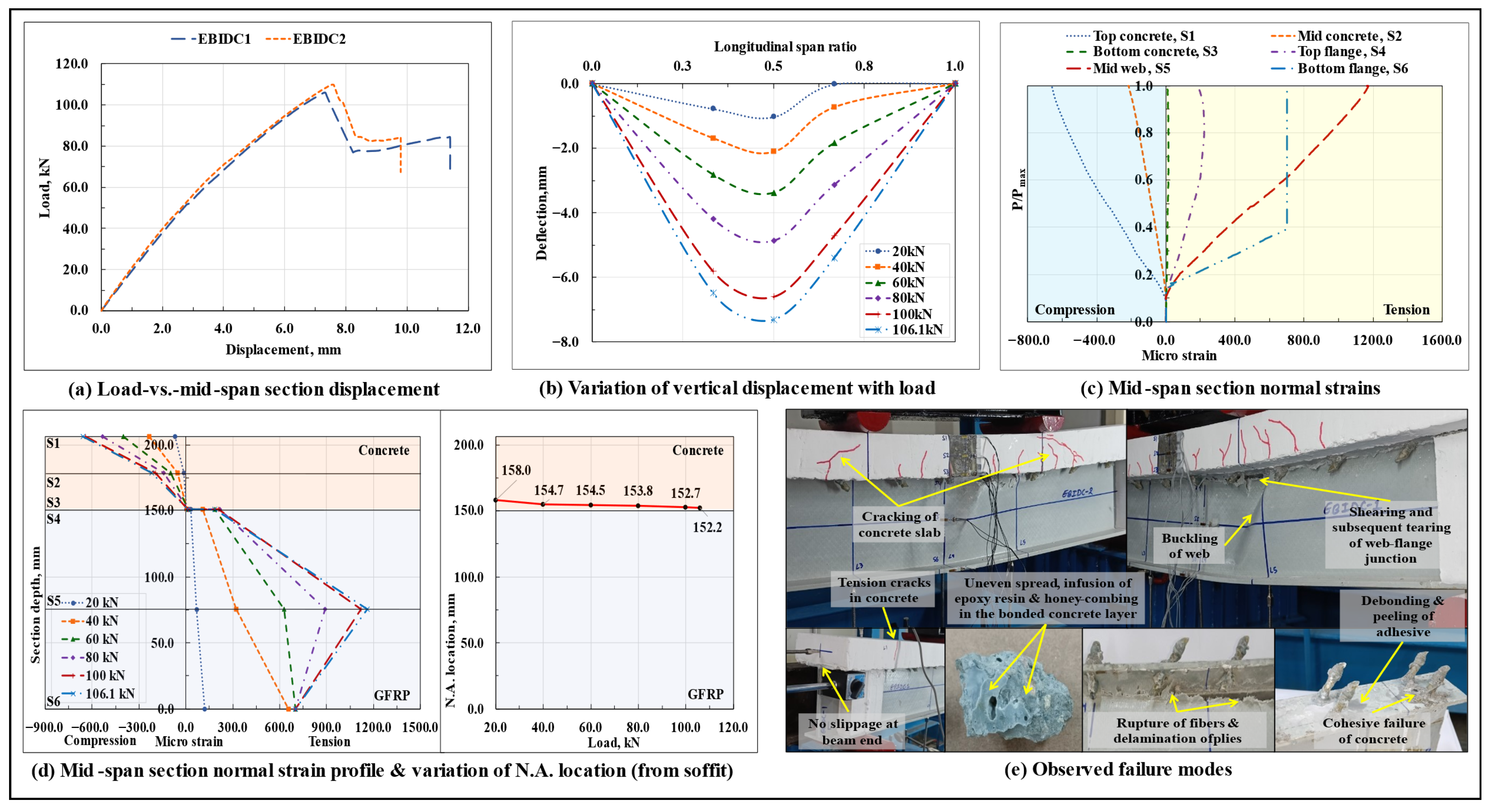 Figure 10c,d), it can be observed that, similar to its unbonded counterpart (IDC composite beam) and in the EBIDC composite beam specimens also, the mid-span section N.A. remained close to the GFRP-concrete interface throughout the test and imparted an almost ideal composite action to the beam till failure. The relatively lower concentration of bearing stresses in the concrete surrounding the dowels led to a substantial reduction in the concrete microcracking and resulted in an almost linear load-normal strain variation in the concrete slab till failure. At around 38% of the peak load level, due to the microstructure level ply failure in the bottom web-flange junction at the mid-span section, the bottom GFRP flange at this region became ineffective in resisting any further tensile stresses. The observed failure modes are shown in