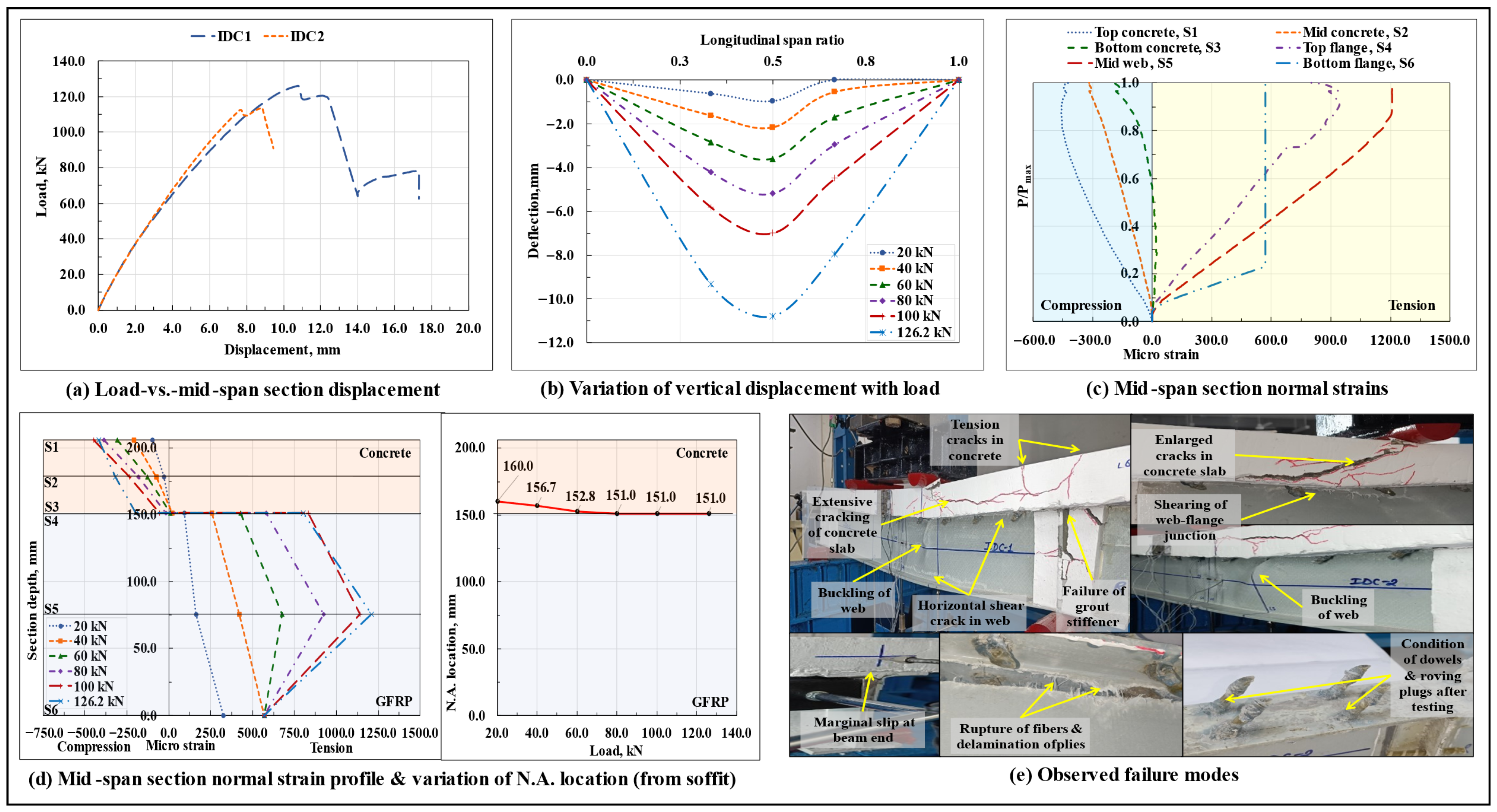 Figure 7e). On the contrary, in the IDC2 specimen, after the formation of initial cracks in the concrete section and the interlaminar delamination of the GFRP I-section profile laminate, no discrete horizontal shear crack appeared in the profile web near the bottom web-flange junction; instead, close to the peak load, a horizontal in-plane shear crack appeared in the right shear span region at the top web-flange junction of the GFRP I-section profile (causing a sudden dip in the corresponding load-vs-vertical displacement curve), which, with the increase in load, elongated and sheared off the top web-flange junction of the GFRP I-section profile. The action was instantaneously accompanied by the buckling of the web and excessive crushing of the concrete slab under one of the loading points. The differences/discrepancies in the composite microstructure, properties of concrete surrounding the dowel, degree of compaction of concrete, and marginal variation in the structural layout of the 45° inclined dowels due to fabrication errors/defects, etc., could be the possible reasons behind such a divergence in the behavior of the two identical specimens.