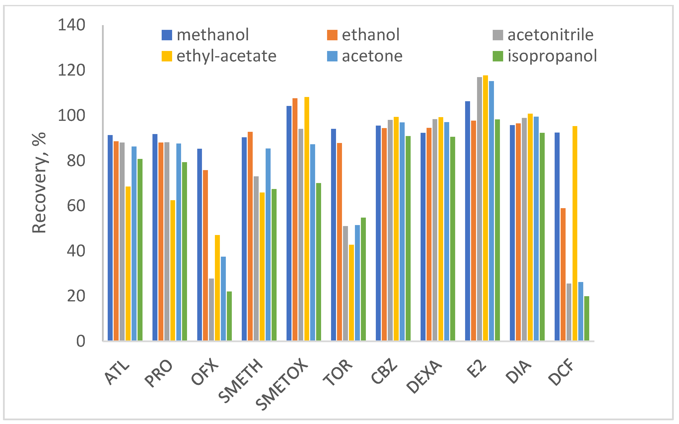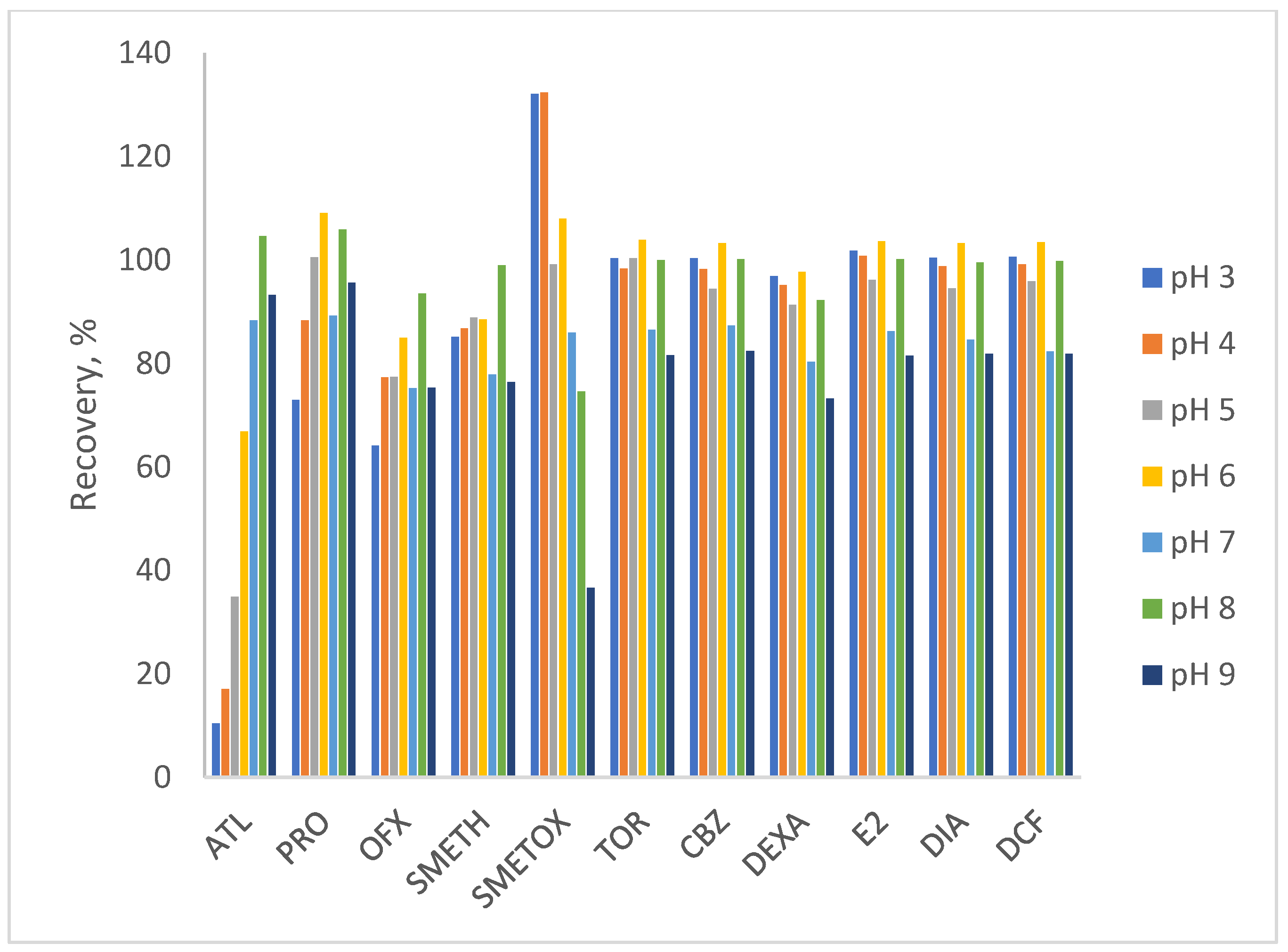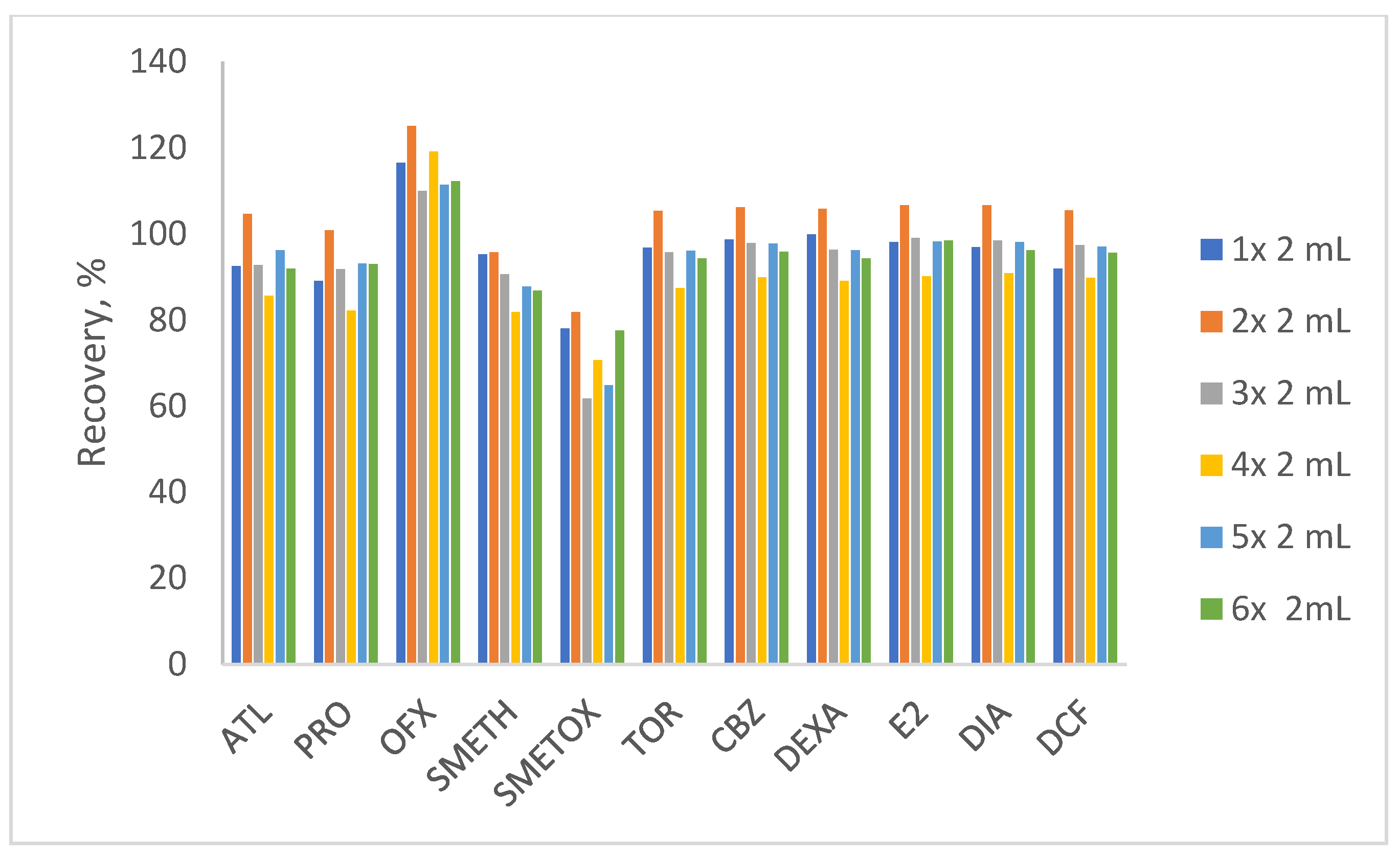 | Pharmaceuticals | Extraction Efficiency, % (n = 3) | ||