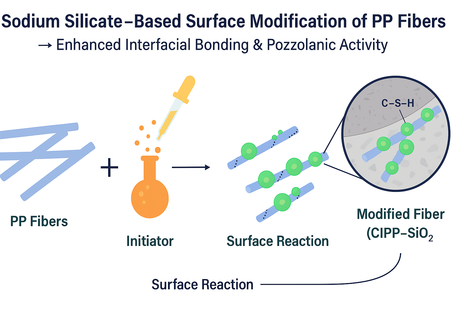 - Silicate Grafting: In the final stage, sodium silicate (Na2SiO3) is added. The hydrolyzed silanol groups (Si-OH) undergo a nucleophilic substitution reaction with the chlorinated sites (CIPP). This results in the covalent attachment of a silicate layer (CIPP-SiO2) (Equation (4)). Consequently, the fiber surface transforms from hydrophobic to hydrophilic, gaining the necessary chemical affinity to bond with the cementitious matrix [12,13,14].