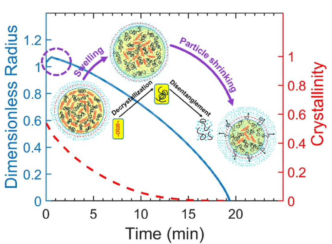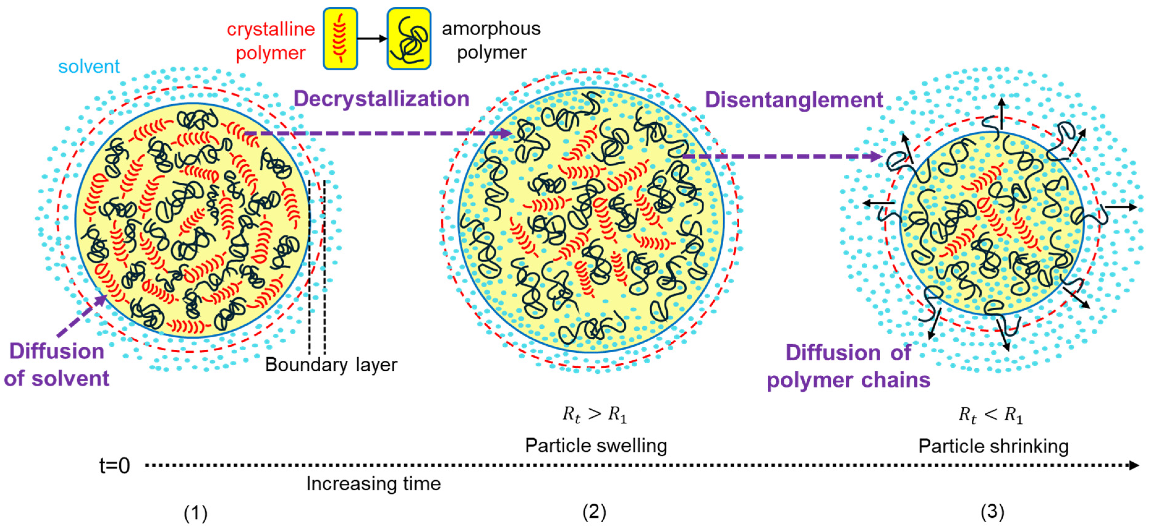 Figure 8), primarily due to longer solvent diffusion pathways. Decrystallization consistently precedes dissolution, but the time gap between the two processes widens with increasing particle size. This suggests that for smaller particles, decrystallization and dissolution occur concurrently, while for larger particles, the dissolution of amorphous polymers, governed by chain disentanglement, becomes the dominant rate-limiting step.
