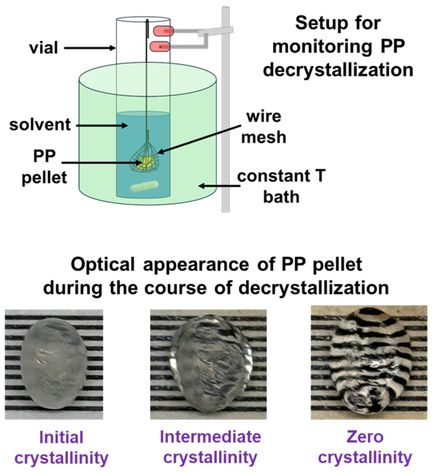 26] tracked polypropylene dissolved mass over time using in situ spectroscopic methods but did not address decrystallization during dissolution. This omission is significant in the dissolution of semicrystalline PP: crystalline domains restrict solvent diffusion and polymer chain mobility, so their disruption largely determines when and how dissolution proceeds. Further, their study lacked an analysis of rate-controlling steps, an evaluation of how solvent characteristics and temperature influence these steps, and any connection of empirical observations to a predictive framework.