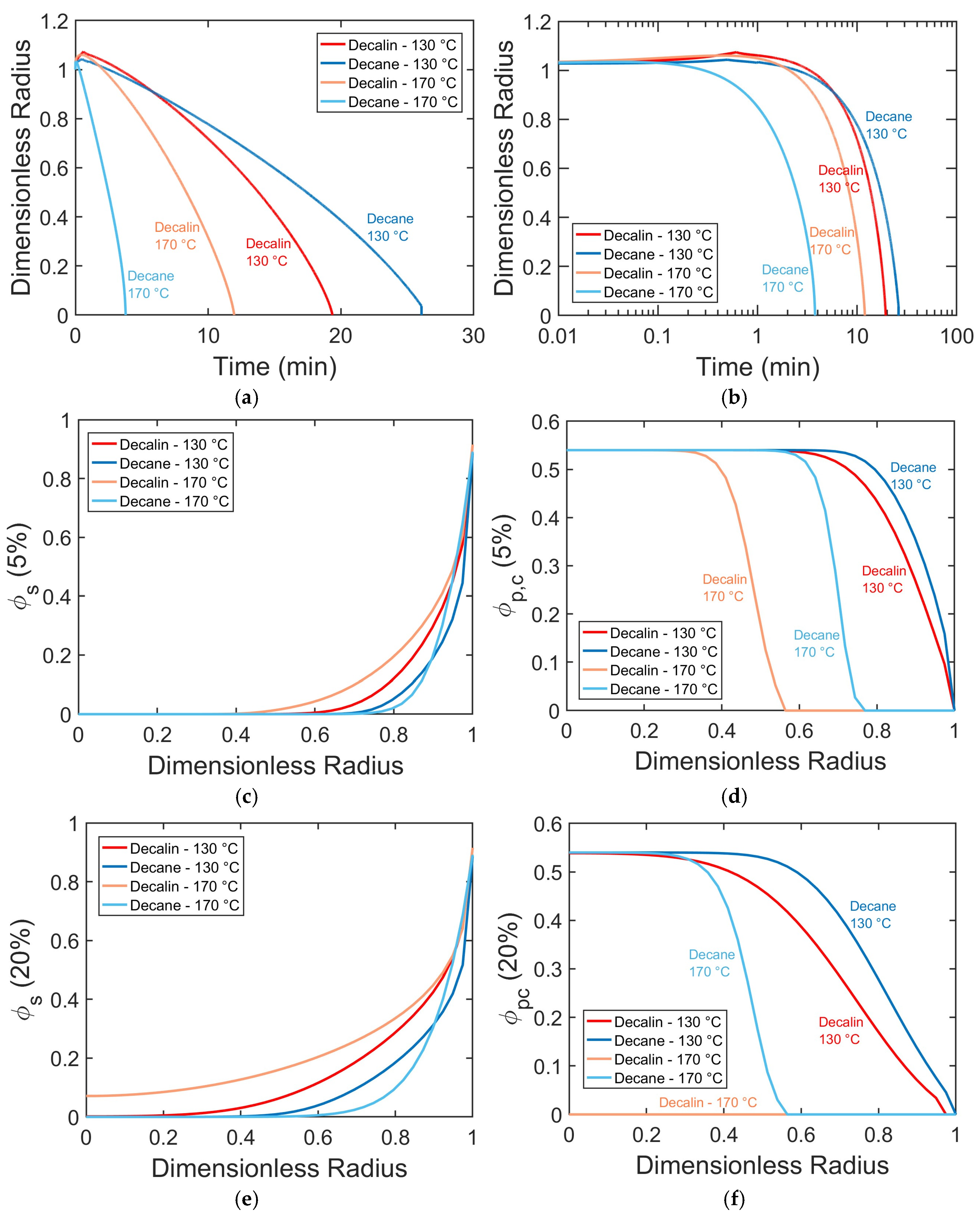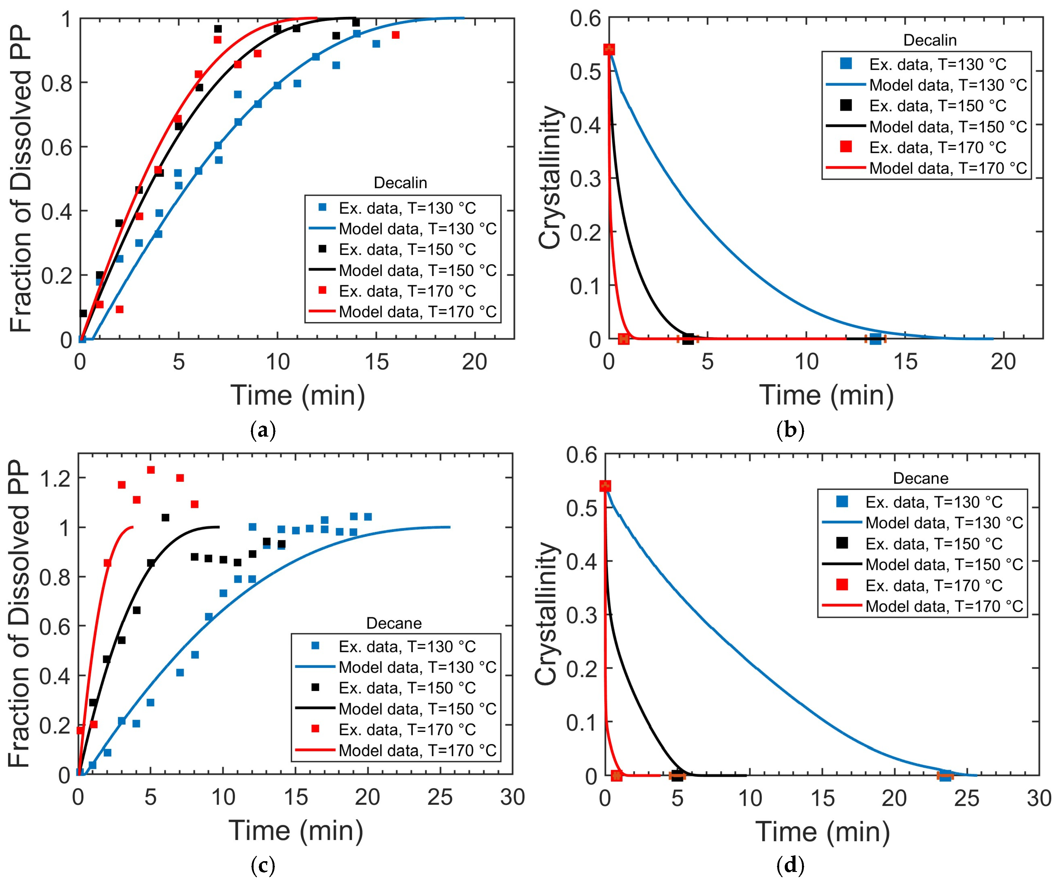 32]. The model incorporates free volume theory to quantify temperature- and composition-dependent variations in solvent diffusivity within PP pellets. The robust predictive capability of this model is validated against experimental data on the dissolved fraction and the time required for the full decrystallization of PP pellets under various temperatures and solvent types, according to the