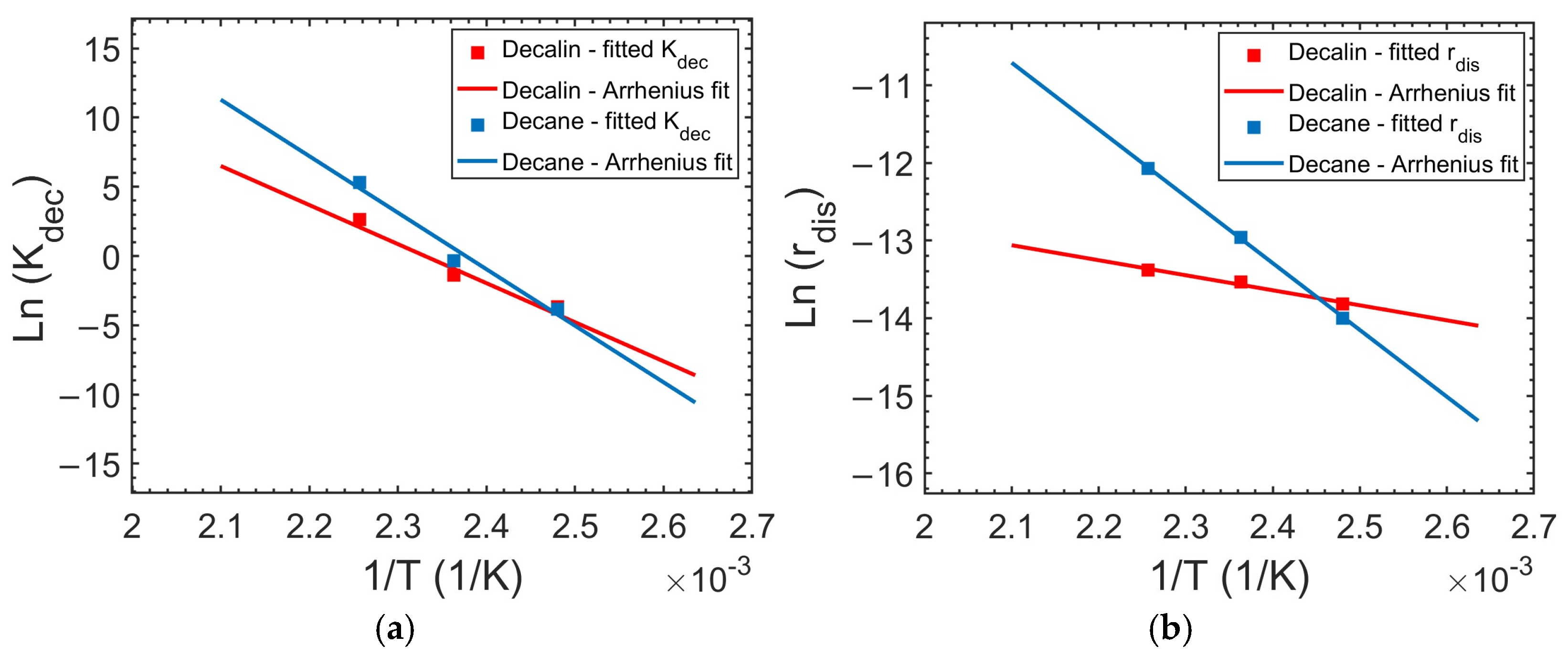 27]. Our model accounts for all relevant solvent-specific factors. The solvent diffusion coefficient is derived within the model and reflects trends consistent with molecular size (e.g., higher diffusivity for decalin compared to decane). Additional factors, such as molecular shape, are implicitly captured through the fitted parameters