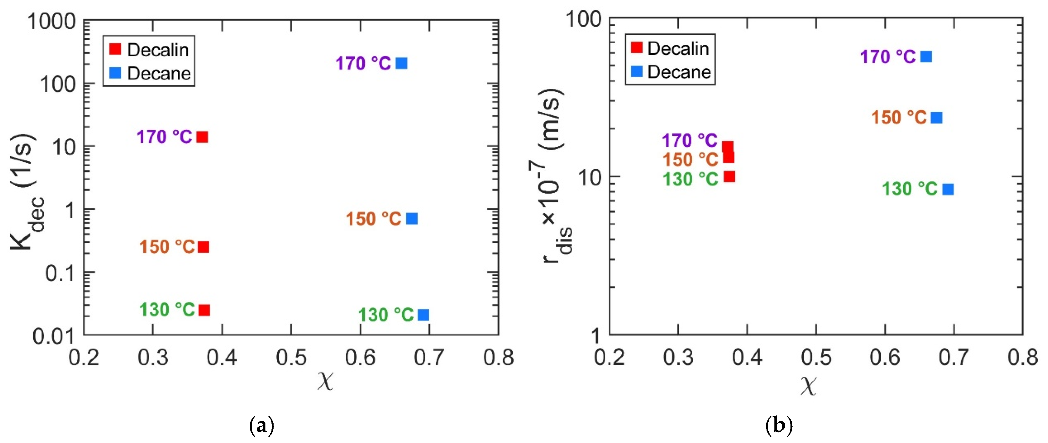 The temperature dependence of Kdec and rdis for PP in decalin and decane, established from experimental data over the 403–443 K range, enables extrapolation across a wider temperature range. Note, however, that the Arrhenius fit for the decrystallization rate constant (Kdec) is valid only below the PP melting point (~166.5 °C (~440 K)). We note that the inclusion of the 170 °C data point in the Arrhenius fit is consistent with the DSC results which indicate that melting is still in progress at this temperature; hence partial crystallinity remains.