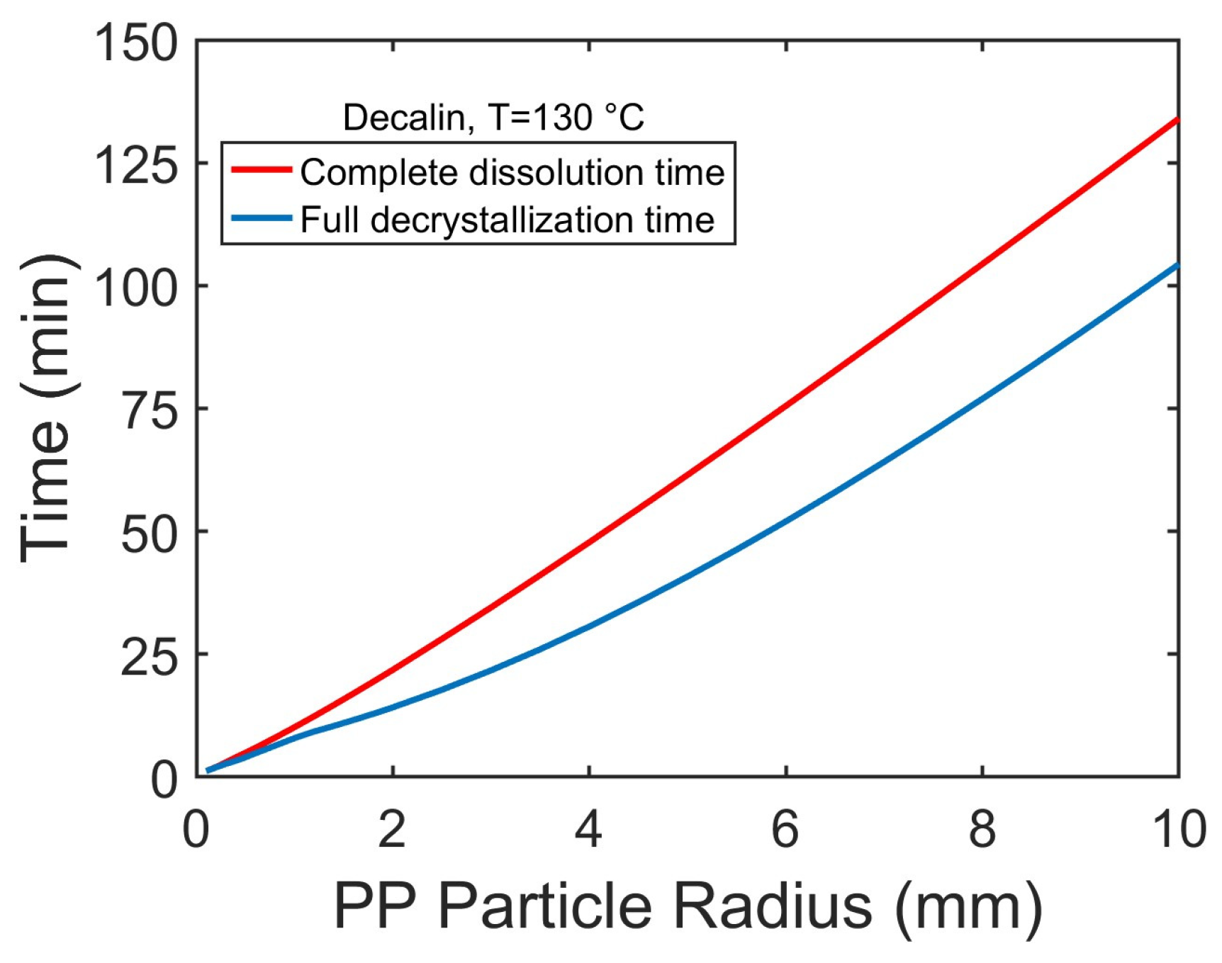 82], we address here the fundamentals of polypropylene dissolution. Specifically, we present a model that describes the different phenomena involved in the dissolution of semicrystalline PP, validate the model with the experimental results on the decrystallization and dissolution kinetics of PP pellets across different solvents and temperatures, obtain insights into the interplay of decrystallization and polymer chain disentanglement during the time-course of dissolution, and predict particle size effects on dissolution utilizing the validated model.