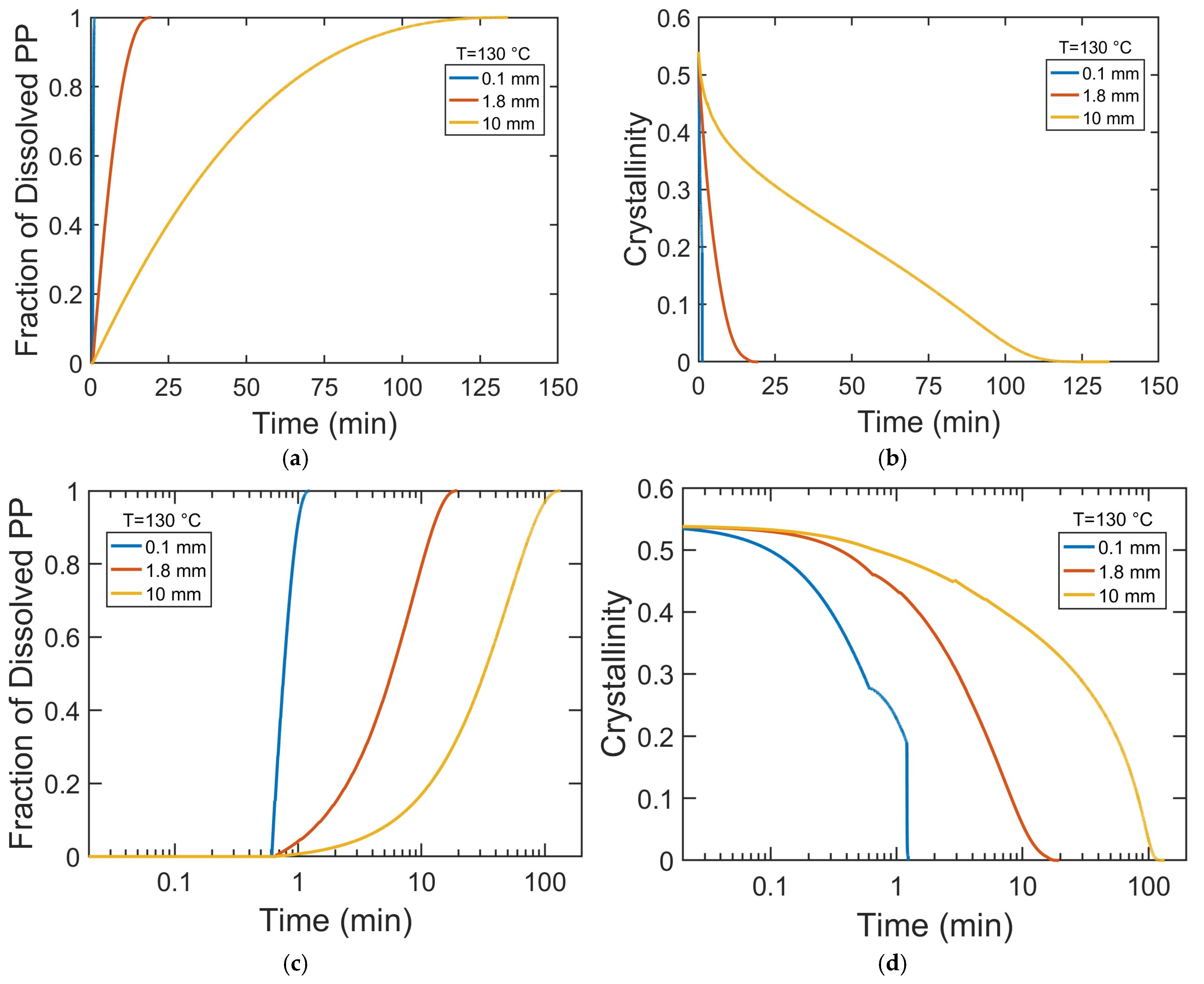 To gain mechanistic insight into how particle size influences dissolution kinetics, we investigated the time evolution of the swelling, decrystallization, and dissolved fraction of PP pellets with varying radii. This analysis provides direct evidence of whether dissolution is primarily governed by solvent diffusion, crystalline disruption, or chain disentanglement and highlights how the dominant mechanism shifts with particle size. To better visualize early-stage kinetics, the time axis is presented on a logarithmic scale in