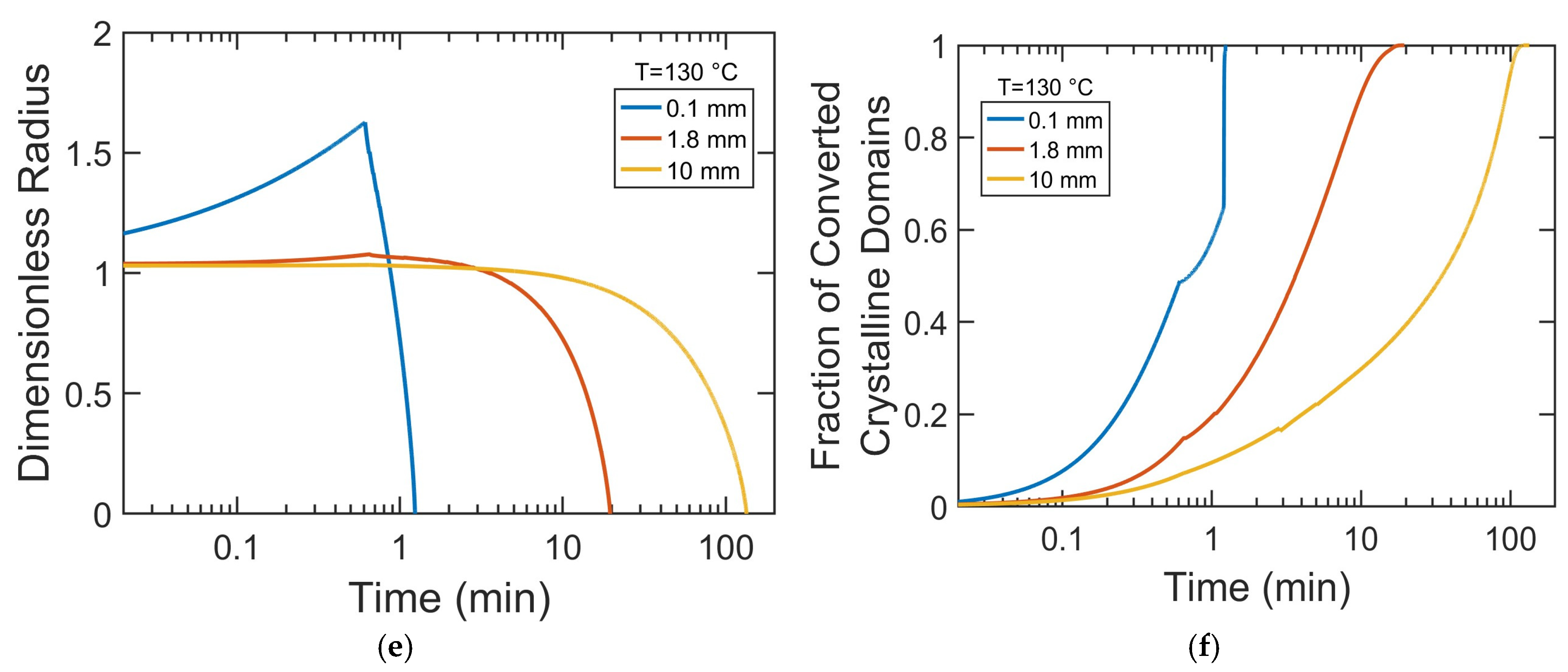 Figure 9e). While 0.1 mm pellets swell extensively and dissolve quickly, larger pellets exhibit little swelling and shrink slowly due to longer solvent diffusion paths and a lower surface-area-to-volume ratio. These factors maintain a solvent-poor crystalline core and delay the complete dissolution of the polymer particles.