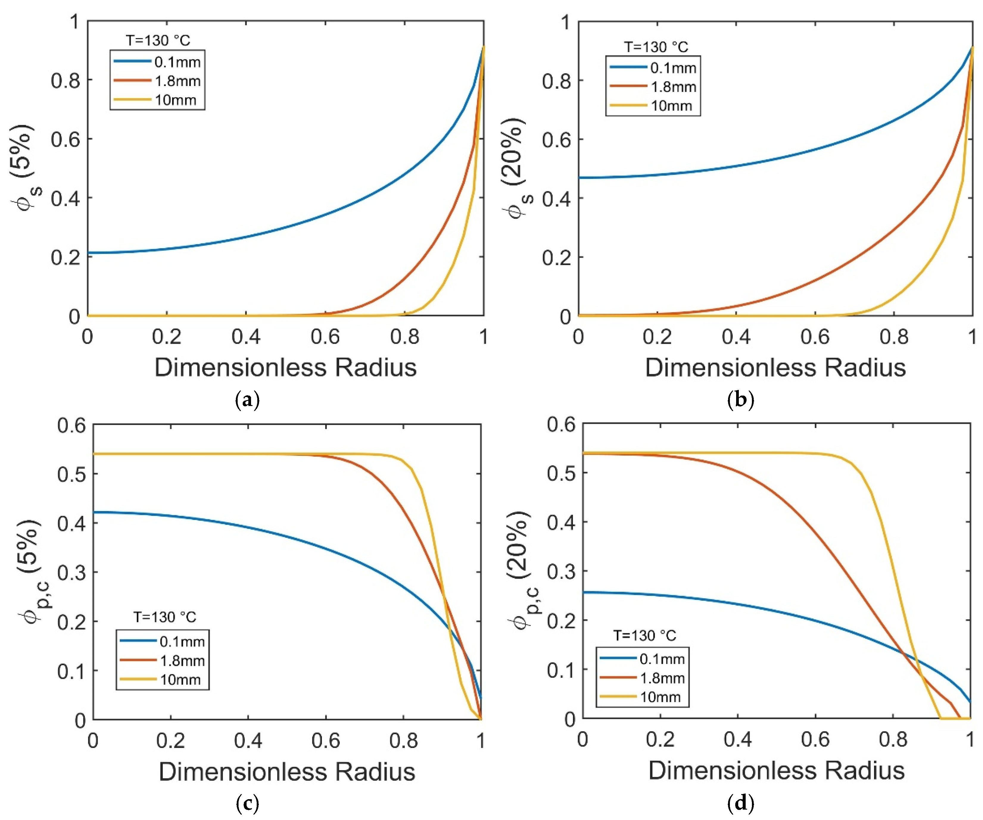 Figure 9a,c). In contrast, for larger particles (1.8 mm and 10 mm), slower solvent diffusion creates significant concentration gradients, leading to a more gradual decrease in PP crystallinity. The degree of swelling is inversely related to particle radius (