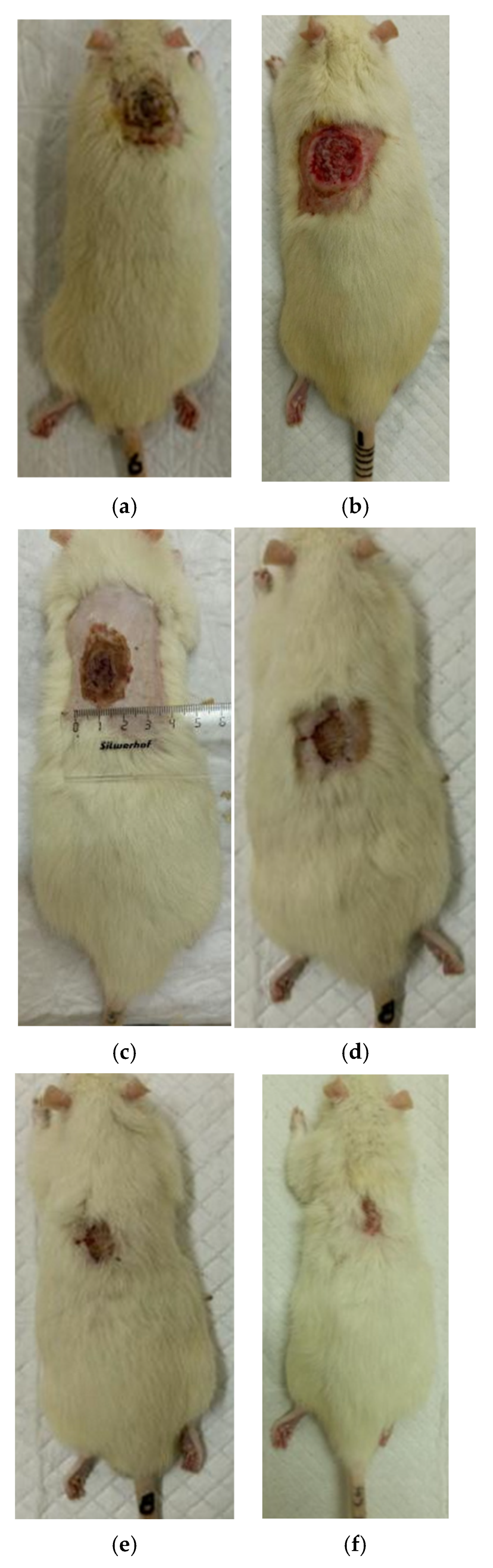 2.7.2. Planimetric Assessment of the Process of Repair of Burn Wounds in Rats