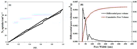 As shown in Table 2, SHPEI-QP presents a porous structure with pore diameters predominantly ranging from 25 to 100 nm. This porous morphology can increase the specific surface area of the material, provide more adsorption sites, and be more conducive to the adsorption of IBU. From the scanning electron microscope images of the internal morphology (Figure 2a,b), it can be clearly seen that SHPEI-QP well maintains a highly porous and interconnected structure after the bifunctional modification on the sponge. The corresponding energy dispersive X-ray spectrometry (EDS) elemental mapping of N, C, and O (Figure 2c) illustrates a homogeneous distribution of N, C, and O atoms in the skeleton of the dried SHPEI-QP. Figure 3 and Table 2 indicate that the BET specific surface area and pore volume of the SHPEI-QP are calculated as 77.2 m2 g−1 and 0.05 cm3 g−1 with its pore size distribution ranging from 25 to 100 nm (analyzed by the DFT method).