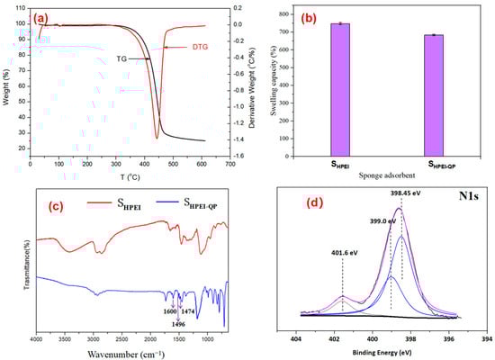 (a) TGA curve of SHPEI-QP, (b) swelling ratios of SHPEI and SHPEI-QP, (c) SHPEI and SHPEI-QP FTIR spectra, and (d) XPS spectra N1s of SHPEI-QP.