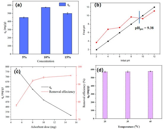 (a) PEI concentration of SHPEI-QP (concentration = 50 mg L−1, dosage = 0.08 g/L, V = 100 mL, pH 7), (b) pHpzc of SHPEI-QP (5 mg SHPEI-QP in 100 mL 0.1 M KCl), (c) effect of adsorbent dosage (C0 = 50 mg/L, V = 100 mL, pH 7), and (d) effect of temperature (concentration = 50 mg L−1, dosage = 0.08 g/L, V = 100 mL, pH 7).