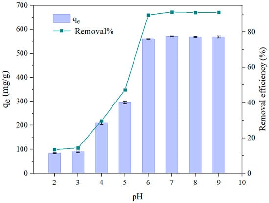 Effect of pH on the adsorption capacity of SHPEI-QP adsorbents (conditions: C0 = 50 mg/L, dosage = 0.08 g/L, V = 100 mL, t = 2 h).