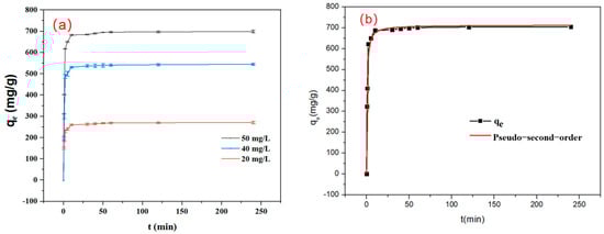 (a) Kinetic curves of the adsorption process (conditions: C0 = 20 mg/L, 40 mg/L, 50 mg/L, dosage = 0.08 g/L, V = 120 mL, pH 7) and (b) fitting for pseudo-second-order equation (conditions: C0 = 50 mg/L, dosage = 0.08 g/L, V = 120 mL, pH 7).