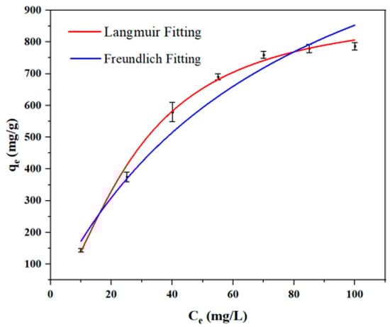 To further elucidate the adsorption characteristics and evaluate the maximum adsorption capacity, the adsorption behavior of IBU on SHPEI-QP was investigated using the Langmuir and the Freundlich isotherm models. The well-established Langmuir (Equation (6)) and Freundlich (Equation (7)) nonlinear models were employed to simulate the adsorption data, which were based on the assumptions of monolayer adsorption on the homogeneous surface and multilayer adsorption on the heterogeneous surface, respectively. The Langmuir model assumes monolayer adsorption on a homogeneous surface without interactions between adsorbed molecules, thereby being appropriate for single-layer adsorption on uniform surfaces. In contrast, the Freundlich model is based on multilayer adsorption on heterogeneous surfaces, applicable to adsorption on non-uniform surfaces.