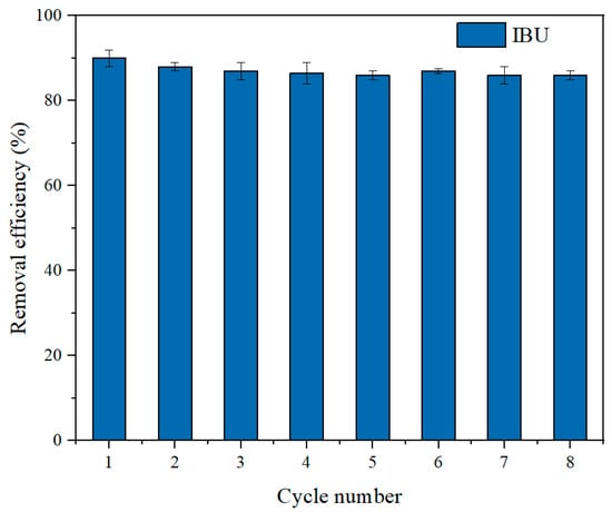 IBU removal efficiencies (%) in eight subsequent adsorption–desorption cycles (conditions: C0 = 50 mg/L, dosage = 0.08 g/L, pH = 7, V = 120 mL, t = 120 min).