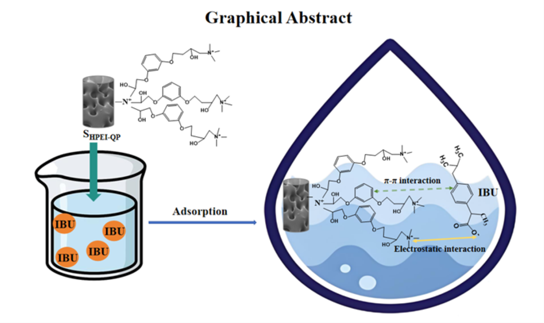 A novel adsorbent material featuring porous SHPEI-QP was synthesized via a low-temperature polymerization method, exhibiting rapid mass transfer capabilities and the advantages of densely functionalized dendritic molecules. This material demonstrates not only a remarkable adsorption capacity (with an adsorption amount of 905.73 mg/g for IBU) but also a rapid adsorption rate, achieving equilibrium within 20 min. The adsorbent integrates the hydrophobicity of phenyl groups with the strong anion exchange functionality of quaternary ammonium groups, thereby conferring significant selectivity and adsorption efficiency toward the polar anion IBU in aqueous solutions. As a high-capacity and highly selective adsorbent, this material fundamentally addresses the key limitations of conventional adsorbents, which typically exhibit low efficiency and poor selectivity for polar ionic compounds. Furthermore, the primary adsorption mechanism for IBU was investigated to be the strong electrostatic interactions between quaternary ammonium groups in SHPEI-QP and deprotonated amines in IBU. Importantly, the three-dimensional skeletal structure facilitates mass transfer, resulting in ultrafast adsorption kinetics. After eight adsorption–desorption cycles, the adsorption efficiency decreased by only 4%, indicating that SHPEI-QP is a reusable adsorbent and is suitable for the removal of IBU from water. Overall, SHPEI-QP represents a sustainable, efficient, reusable, cost-effective, and eco-friendly adsorbent, capable of effectively and selectively removing potentially toxic anionic pollutants from complex aqueous environments. The strength of electrostatic interactions plays a critical role in governing the dominant adsorption process.