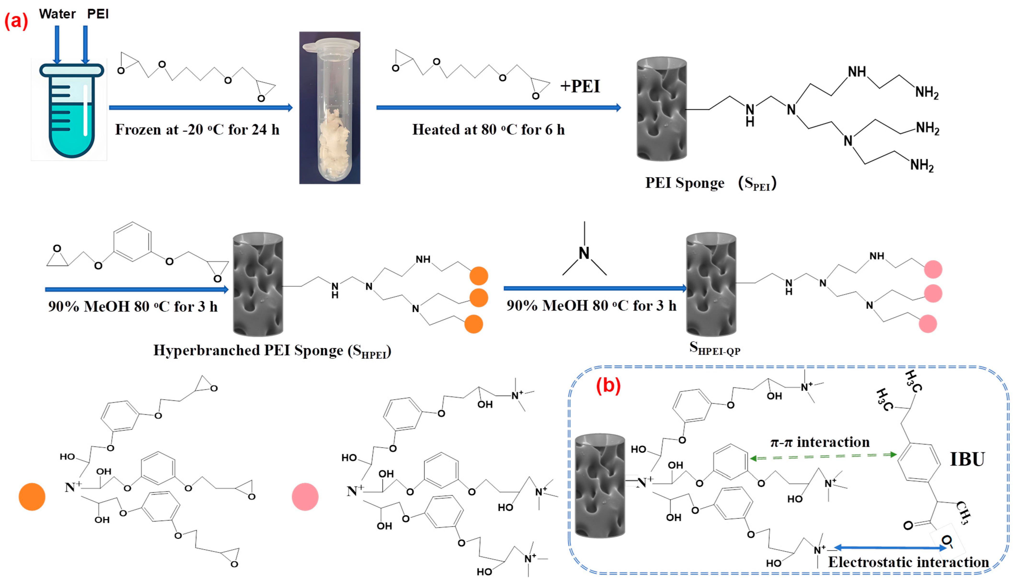 In this study, a hyperbranched functionalized sponge adsorbent was synthesized via crosslinking and grafting techniques to achieve efficient removal of ibuprofen (IBU) from aqueous solutions. This study is the first to use cross-linked PEI sponge as a substrate and further graft PEI on the sponge to provide more modifiable sites. Finally, the hyperbranched sponge was bifunctionalized. The developed adsorbent exhibited notable properties, including high adsorption capacity, excellent reusability, and cost-effectiveness. Specifically, to introduce a higher density of amino functional groups, high-molecular-weight polyethyleneimine (PEI) was first grafted onto the surface of the sponge-like matrix. Subsequently, additional functional groups were incorporated into the polymer sponge through reactions with resorcinol diglycidyl ether and methylamine. To evaluate the adsorption behavior of ibuprofen (IBU) on the sponge and clarify the underlying mechanism, systematic studies were conducted, covering adsorption kinetics, thermodynamics, selectivity, and reusability. Compared with conventional adsorbents, the hyperbranched functionalized sponge offers multiple distinct advantages: first, its reticular sponge-like structure facilitates the penetration of wastewater, ensuring comprehensive contact and efficient adsorption; second, the three-dimensional architecture of hyperbranched polymers imparts unique characteristics such as high solubility, abundant terminal groups, and internal functional moieties, rendering them promising candidates for adsorption materials, drug delivery systems, and other functional carriers; third, the abundant functional groups in bifunctionalized polymer material facilitate effective removal of IBU via anion exchange interactions. Consequently, the synthesized bifunctionalized adsorbent demonstrates considerable potential for the adsorption and elimination of IBU in aquatic environments.