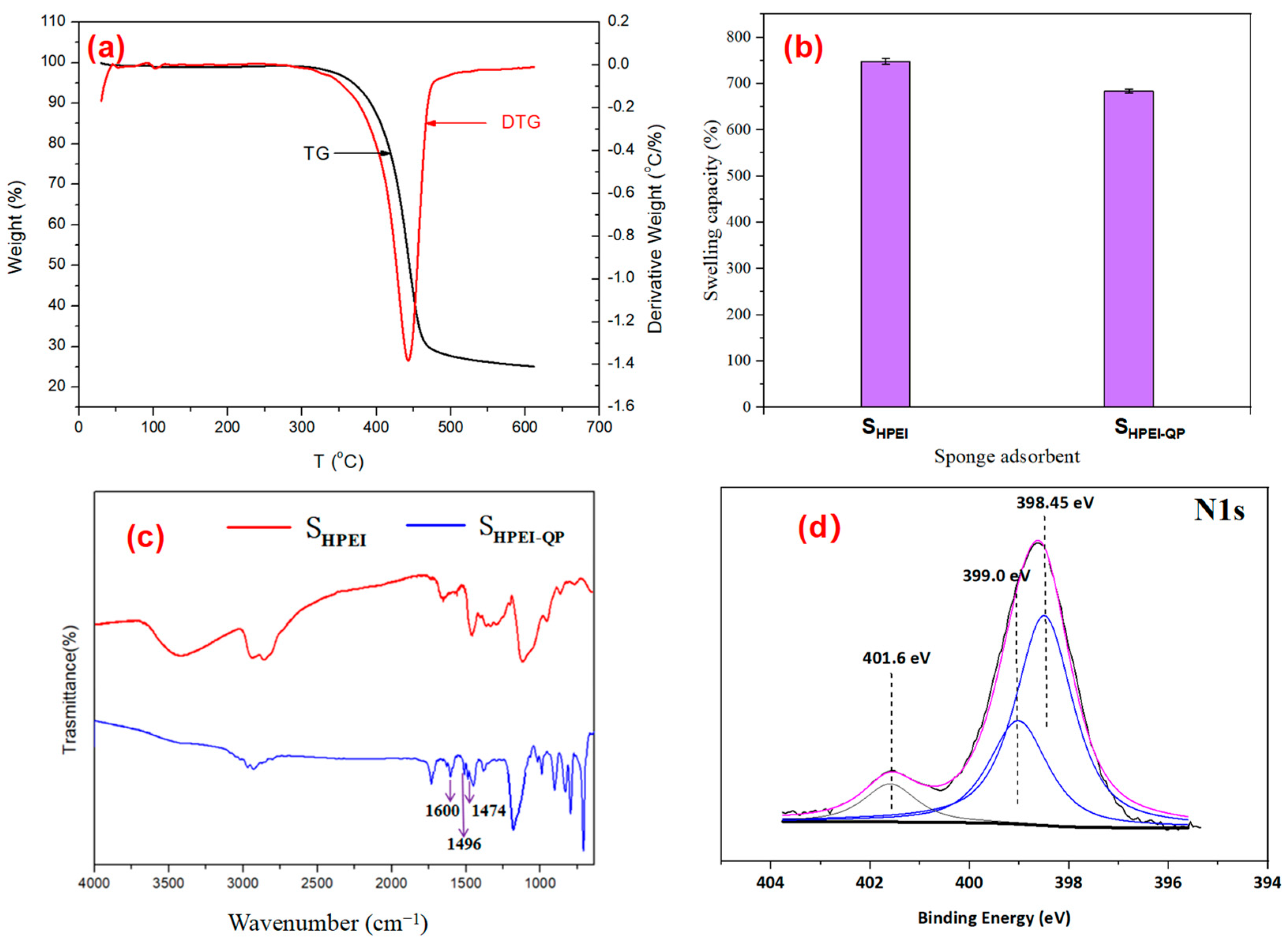 Figure 4. (a) TGA curve of SHPEI-QP, (b) swelling ratios of SHPEI and SHPEI-QP, (c) SHPEI and SHPEI-QP FTIR spectra, and (d) XPS spectra N1s of SHPEI-QP.