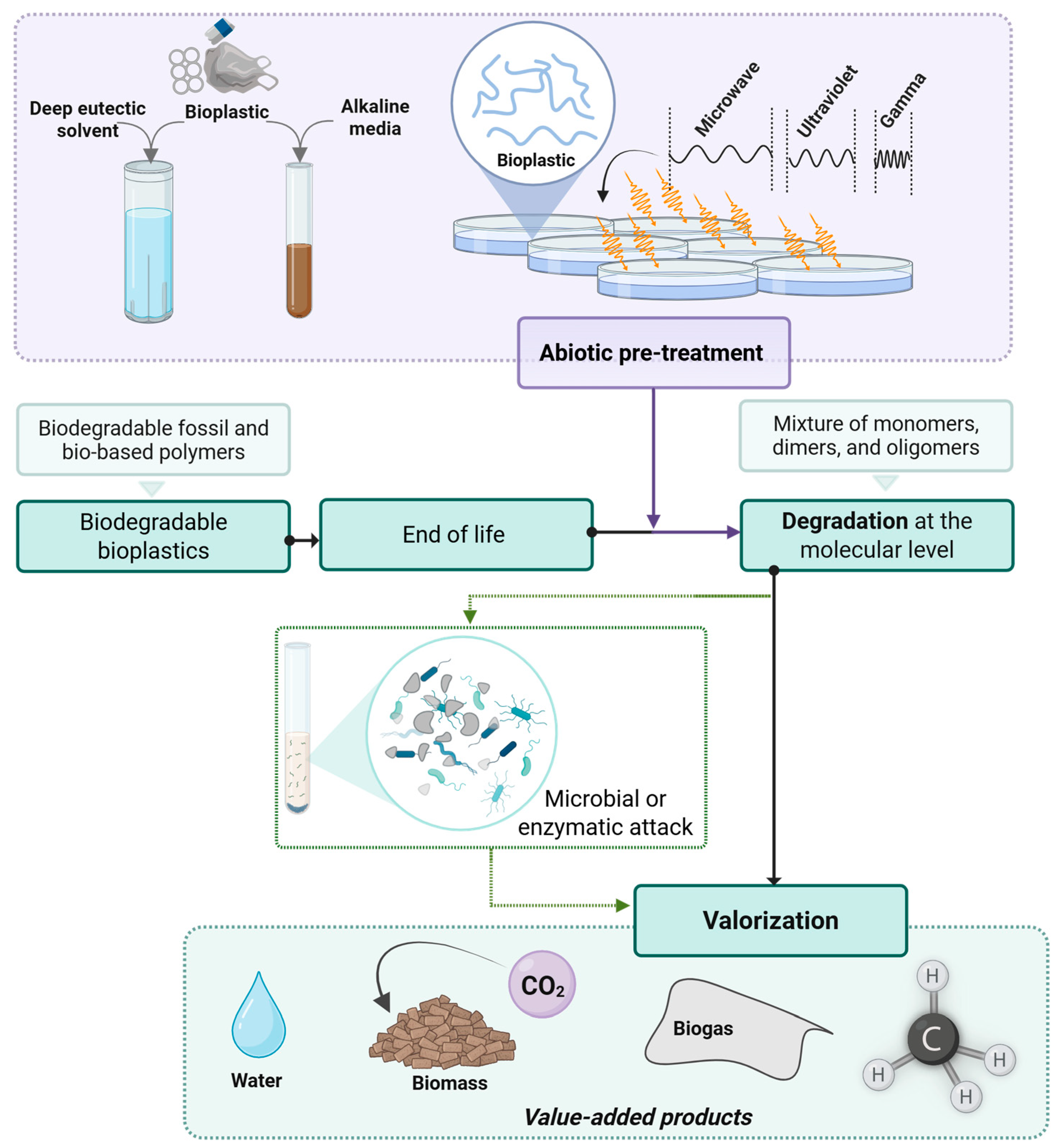 The present review aims to address this gap by integrating two complementary aspects. First, it consolidates the available evidence on how abiotic pretreatments modify bioplastic properties in ways that influence their subsequent biodegradation and valorization. Second, it identifies the most informative indicators to track the pretreatment-to-biodegradation pathway, highlighting cases where a direct causal link has been experimentally demonstrated. Through this dual focus, this review aims to offer an updated overview of abiotic degradation technologies applied to bioplastics, focusing on their role in enhancing subsequent biological valorization routes towards cradle-to-cradle pathways under a biocircular economy framework.