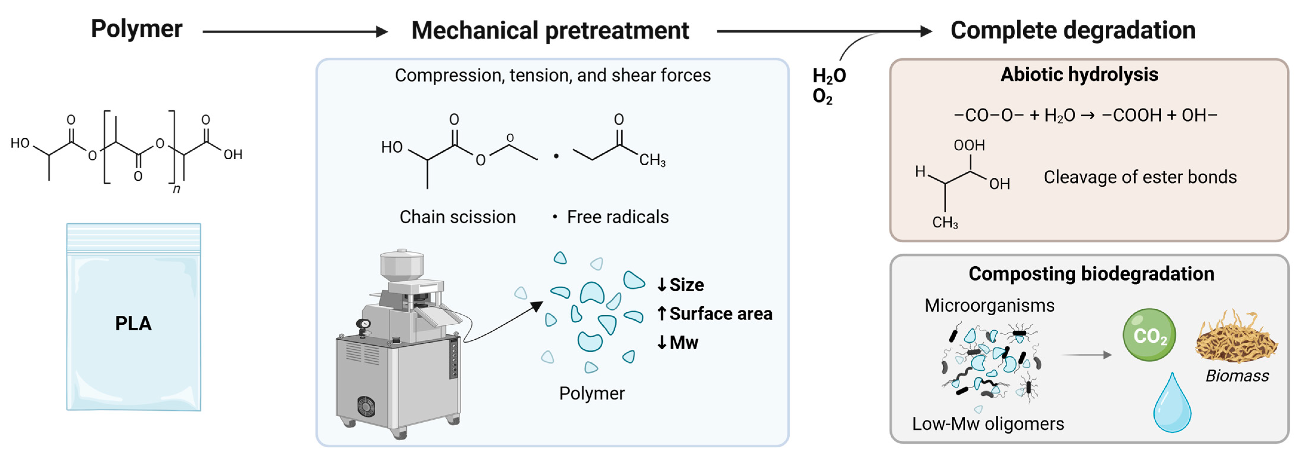 Traditional classification of degradation pathways refers to the process occurring in the absence (abiotic) or presence (biotic) of biological activity. Abiotic degradation includes physical and chemical degradation mechanisms such as mechanical, thermal/thermo-oxidative, photo/photo-oxidative, hydrolytic (chemical), and ozonation degradation, which environmental factors like oxygen, moisture, heat, and ultraviolet radiation can trigger [11,50]. In contrast, biotic degradation involves the enzymatic or microbial breakdown of polymers into water, carbon dioxide/methane, and biomass. These pathways can act independently or synergistically, with abiotic processes often facilitating subsequent microbial attack by reducing molar mass or introducing polar functional groups that allow subsequent reaction and chain scission [51]. With an understanding of the mechanisms that are involved, the biodegradation process can be optimized [8]. In the literature, some polymer degradation pathways, such as biodegradation, photodegradation, and thermo-oxidative degradation, are thoroughly discussed [3,50,52,53].