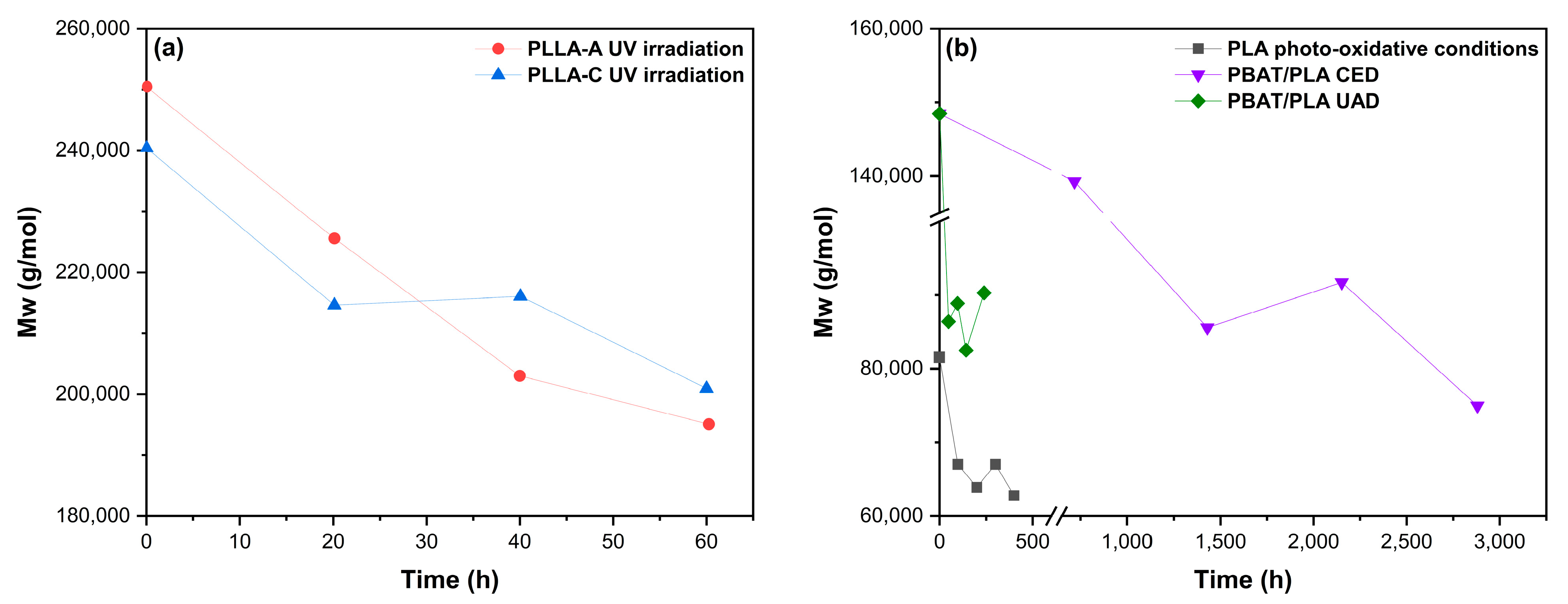 The chemical structure of the polymer backbone strongly influences the degradation rate of bioplastics [49]. In particular, bond dissociation energies (BDEs) determine the susceptibility of specific bonds to cleavage. Typical average energies for homolytic cleavage of chemical bonds such as C-C, C-H, C-O, C=C, and O-H range from ~80 kcal/mol up to 160 kcal/mol, although the chemical environment can modify the effective energy required for cleavage [87]. These values typically refer to processes initiated by photo-oxidative or thermo-oxidative mechanisms. Polymers with lower BDE bonds are more prone to chain cleavage and subsequent oxidation.