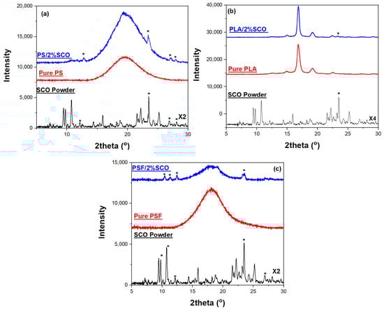 Figure 1. The XRD patterns of the (a) PS, SCO and PS/2% SCO films, (b) PLA, SCO and PLA/2% SCO films, and (c) PSF, SCO and PSF/2% SCO films; the presence of the SCO in the composite films is indicated by an asterisk.