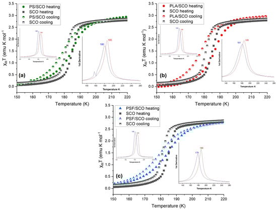 Figure 2. The magnetic susceptibility measurements as a function of temperature (χMT vs. T) during heating and cooling for the (a) PS-SCO, (b) PLA-SCO, and (c) PSF-SCO composite (the curve of the pristine SCO material is also given for comparison); the first derivative, from which the T1/2 was calculated, is shown on the insets of each Figure (in the left inset for the SCO complex and in the right for each polymer). The broadened derivative peaks in the composites indicate a dispersion of local transition temperatures arising from microenvironmental heterogeneity within the polymer matrices.