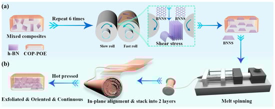 For the exfoliated, oriented, and continuous samples (the continuous samples), after the six-time repeats of the sequence, the samples were not directly hot-pressed but cut into rectangular specimens (1 × 1 cm2). After thorough drying, the sample was processed in a twin-screw extruder to produce melt-spinning masterbatches. The temperature profile of the extruder was set to 200, 230, 240, and 240 °C for the feeding, compression, homogenization, and die zones, respectively, with a screw speed of 100 rpm. The resulting masterbatches were subsequently spun into COP-POE/BNNS composite fibers using a micro-scale melt-spinning apparatus. The temperature of the apparatus was maintained at 180, 240, and 240 °C for the feeding, melting, and die zones, respectively, with a screw speed of 10 rpm and a take-up velocity of 40 m/min. The fibers were aligned in-plane and hot-pressed at 240 °C for 10 min under a pressure of 10 MPa. The overall fabrication procedure is illustrated in Figure 1a,b. The samples were labeled with “X-C”, where X represents the wt% of boron nitride. For example, “27-C” refers to the exfoliated, oriented, and continuous samples prepared from 27 wt% h-BN, with 70 wt% COP and 3 wt% of POE, where the POE wt%:COP wt% was fixed at 3:70.