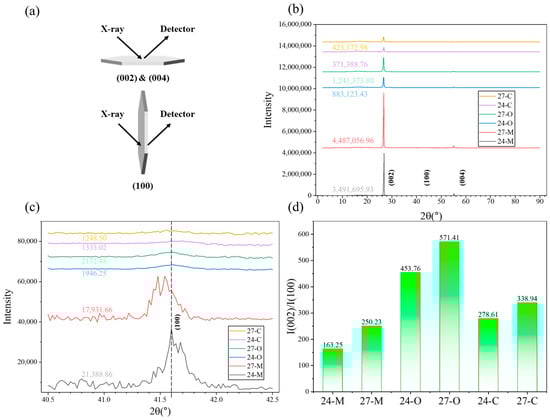 As shown in Figure 3b, the intensity of peak (002) (I(002)) from the X-O and X-C samples was lower than that from the X-M samples at the same BN loading, indicating that the BN particles were successfully exfoliated into BNNS during the six cycles of the FFRS processing. Furthermore, the peak (002) from the X-O and X-C samples remained at an identical degree (around 26.7°) to that from the X-M samples, indicating that the FFRS processing introduced nearly no damage to the crystalline structure of BN, which remained unchanged during the exfoliation. The same applied to peak (100) (Figure 3c) as well, which remained at an identical degree (around 41.6°) across all samples. Moreover, the orientation degree of the BN in the COP composites could be evaluated via the ratio of the intensity of peak (002) against peak (100), i.e., I(002)/I(100), whereof the result is shown in Figure 3d. Both the 24-O and 27-O samples showed the highest value, corresponding to the highest in-plane orientation degree among the composites, indicating the validity of introducing the in-plane orientation to the BN particles via the six cycles of the FFRS process. In comparison, the 24-M and 27-M samples showed the lowest value, corresponding to the random orientation via the direct mixing. As for the 24-C and 27-C samples, the values were slightly lower than the 24-O and 27-O samples, corresponding to a lower in-plane orientation degree due to the disorientation effect during the melt spinning process. Nevertheless, the reorientation effect via the following fiber alignment and the hot-pressing process still ensured a higher in-plane orientation degree than that of the 24-M and 27-M samples, finally.