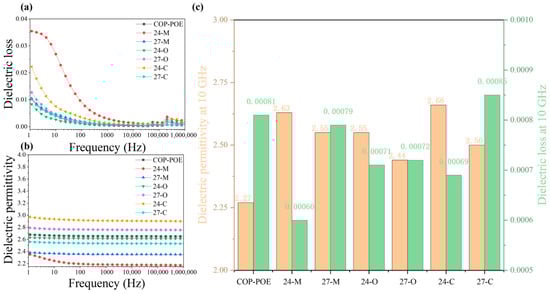 Dielectric performance of samples: (a) dielectric permittivity from 1 Hz to 1 MHz; (b) dielectric loss from 1 Hz to 1 MHz; (c) dielectric permittivity and dielectric loss at 10 GHz.