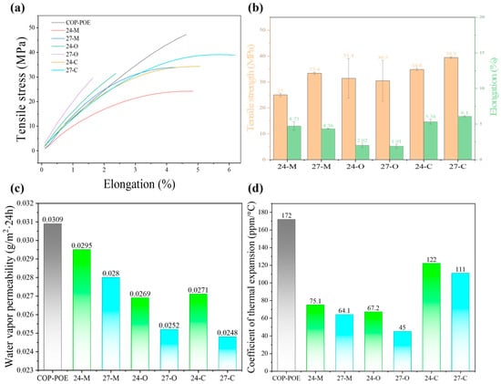 Further performance of samples: (a) tensile stress–elongation curve; (b) tensile strength and elongation at break; (c) water vapor permeability; (d) CTE.